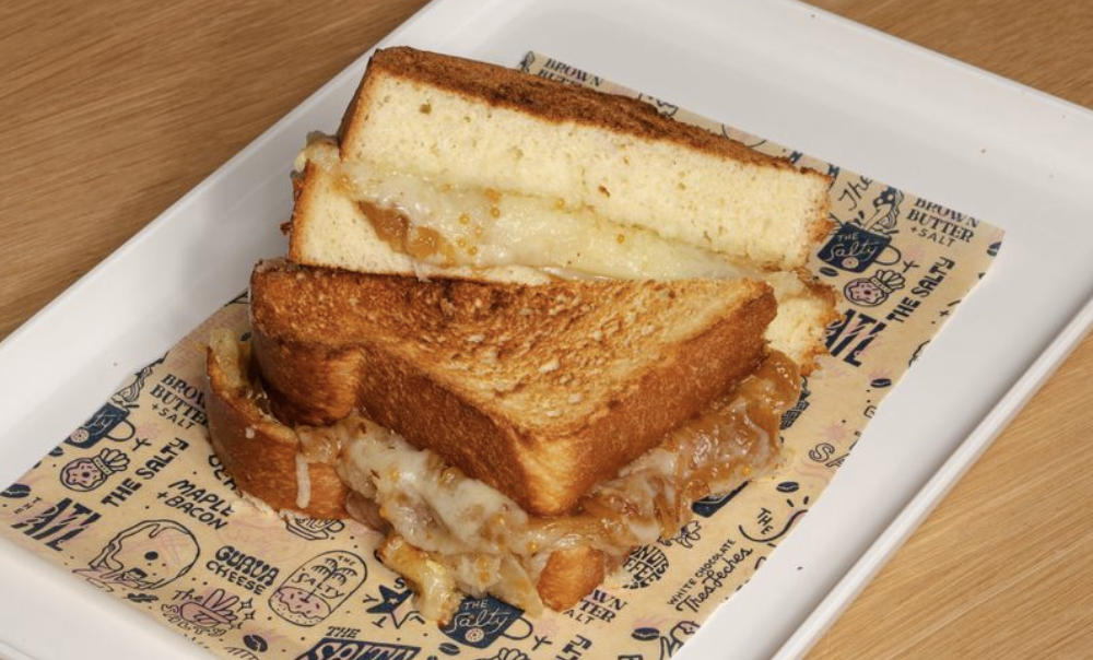 Gruyère and Swiss grilled cheese layered with housemade apple mostarda and caramelized onions