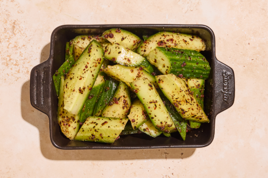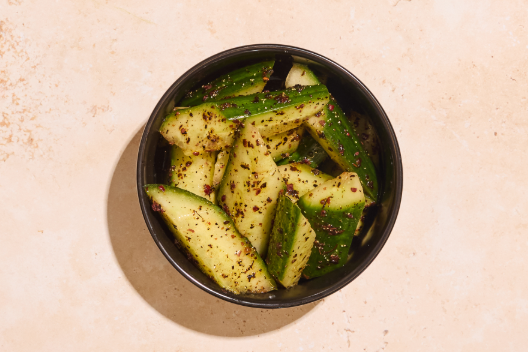 English Cucumbers, Apple Cider Vinegar, Shallots, Garlic, Salt, EVOO, Lemon Juice, Sumac, Black Urfa Chili, Sea Salt.