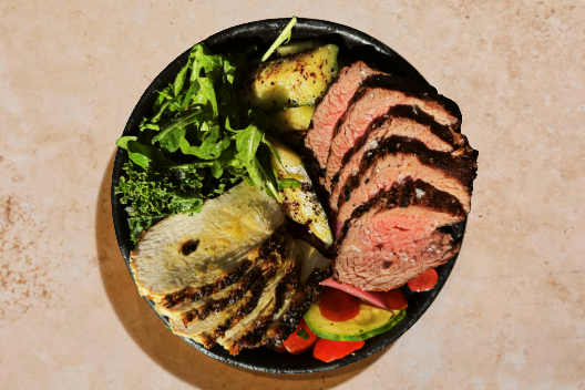Grass-fed Steak, Rosemary Roasted Chicken Breast, Marinated Cucumbers, Tomato & Cucumber Salad, ½ Pecan Kale Caesar, ½ Farm Greens, Basil Pesto (un)dressing | *Contains Soy | *Contains Dairy | *Contains Pecans | 723 CAL