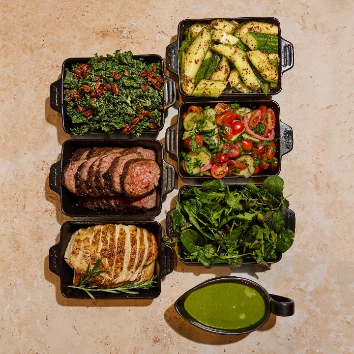 Grass-fed Steak, Rosemary Roasted Chicken Breast, Marinated Cucumbers, Tomato & Cucumber Salad, ½ Pecan Kale Caesar, ½ Farm Greens, Basil Pesto (un)dressing | *Contains Soy | *Contains Dairy | *Contains Pecans