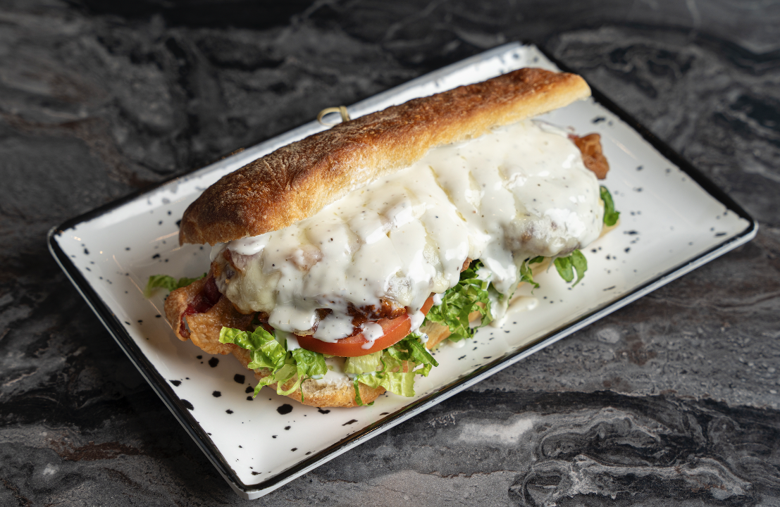 Crispy chicken, bacon, provolone, ranch sauce, lettuce, tomato on focaccia