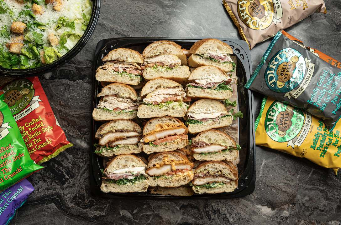 This platter includes up to 4 varieties of sandwiches and will serve 20 people. It also includes 5 assorted potato chips. Please note that we do not automatically include plates or serving utensils.
