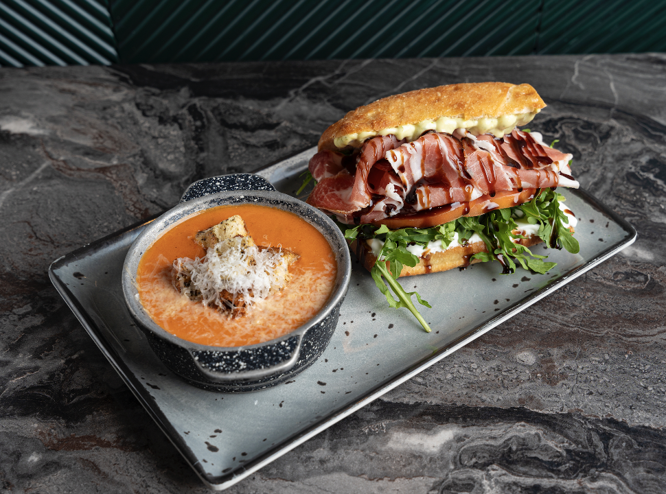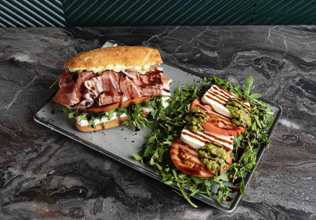 Prosciutto di Parma, burrata, pesto mayo, arugula, balsamic glaze on focaccia
