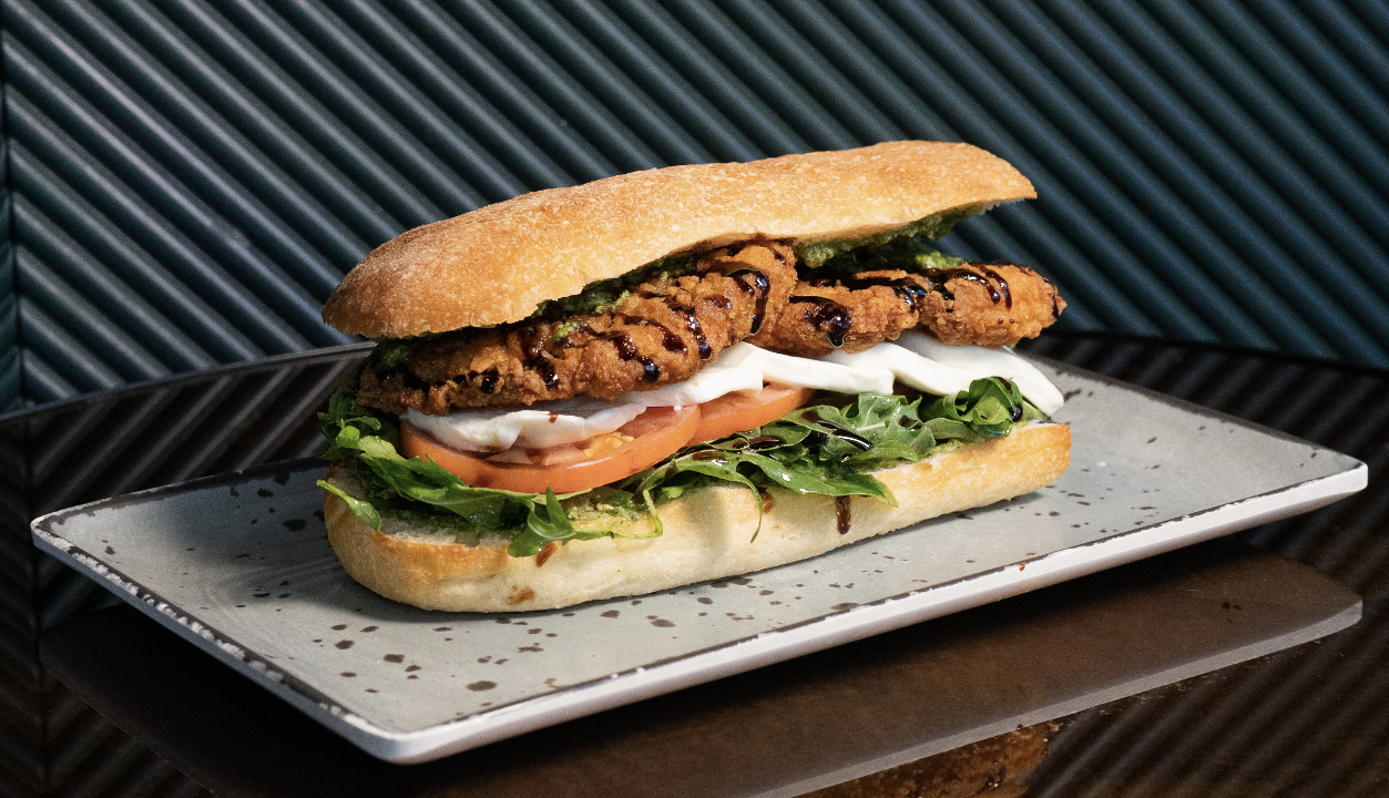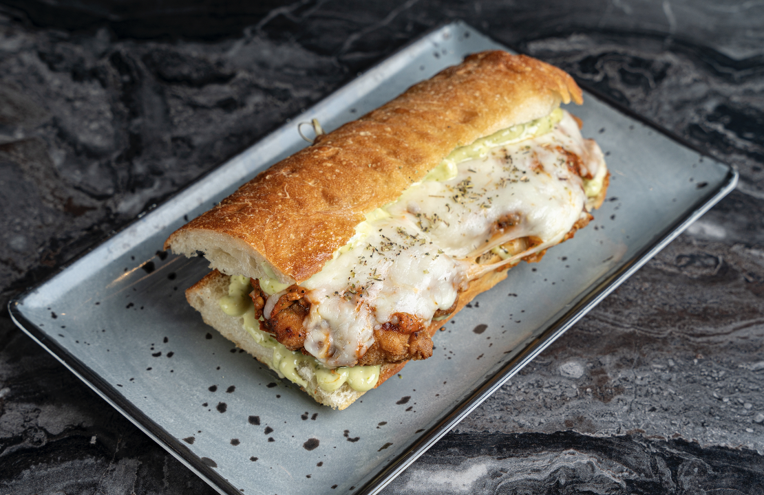 Crispy chicken, provolone, vodka sauce with pesto (nut-free), housemade pesto mayo on focaccia