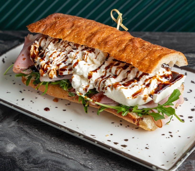Ham, burrata, arugula, balsamic glaze on focaccia