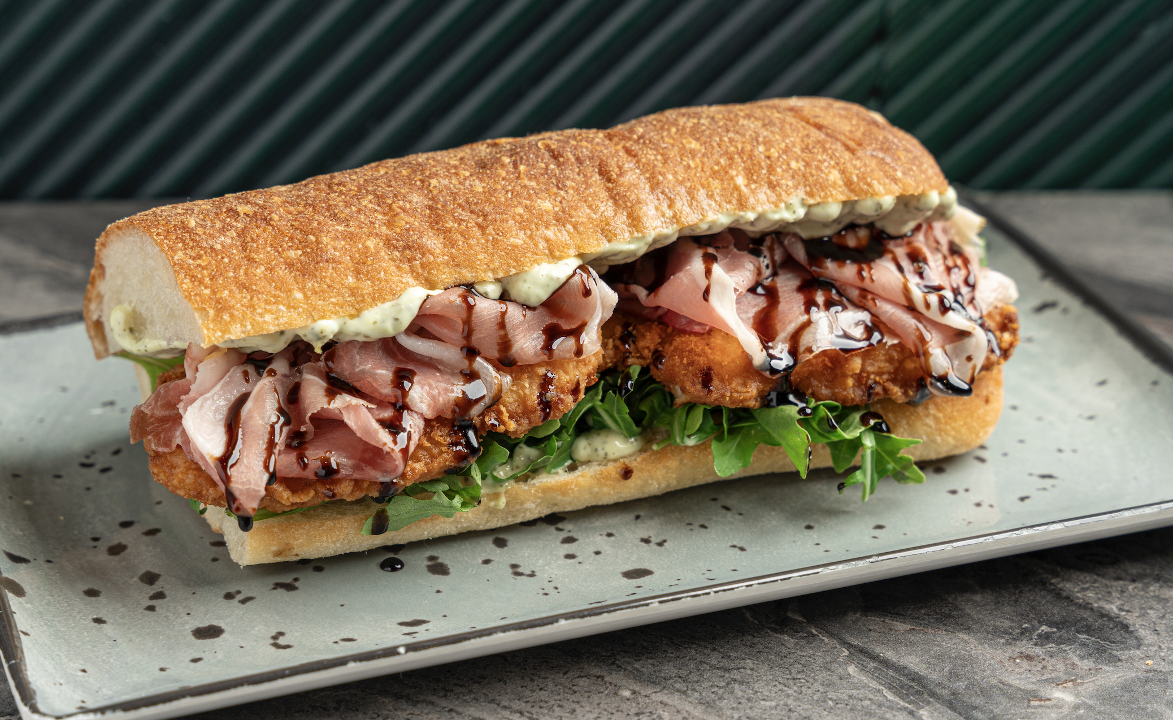 Prosciutto di Parma, chicken cutlet, pesto mayo, balsamic glaze, arugula on focaccia bread