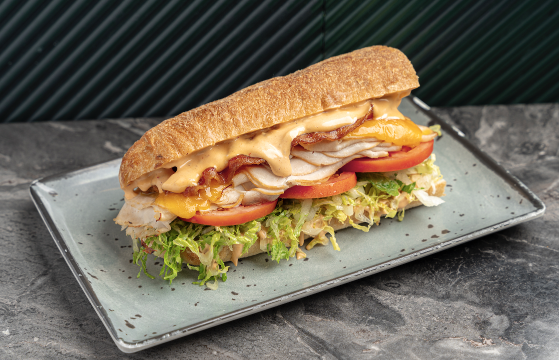 Turkey, cheddar, bacon, avocado, lettuce, tomato, homemade chipotle mayo (spicy)