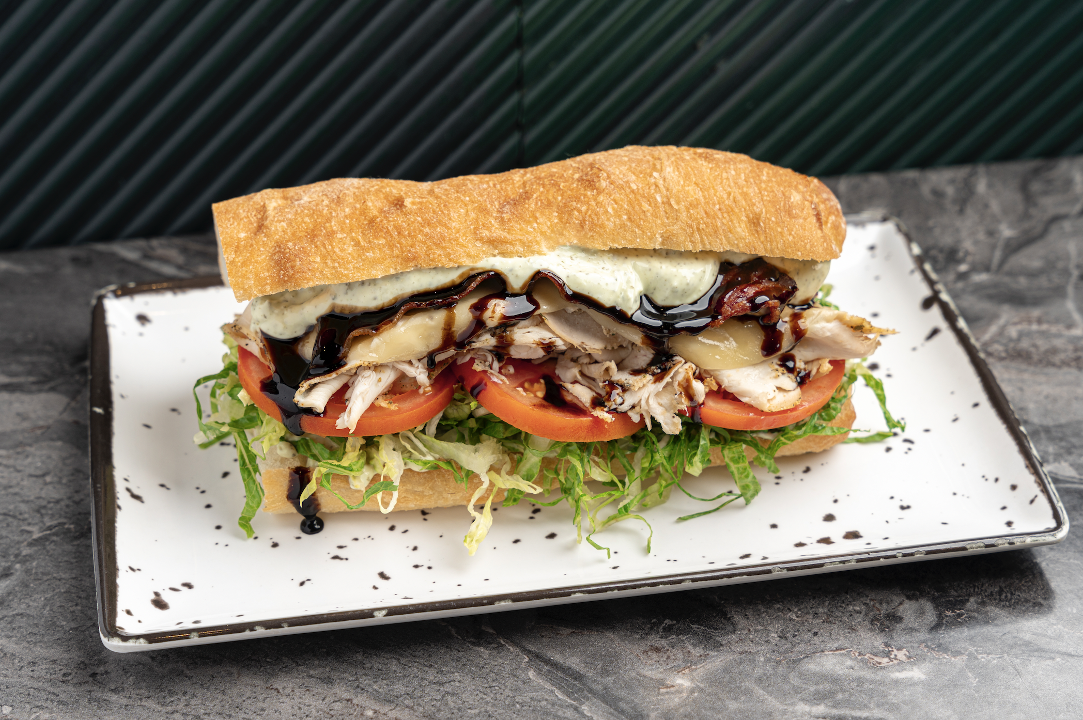 Sliced grilled chicken, bacon, provolone, lettuce, tomato, balsamic glaze, housemade pesto mayo on focaccia
