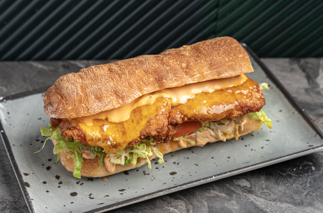 Crispy chicken, cheddar, housemade chipotle mayo, hot honey, lettuce, tomato on focaccia