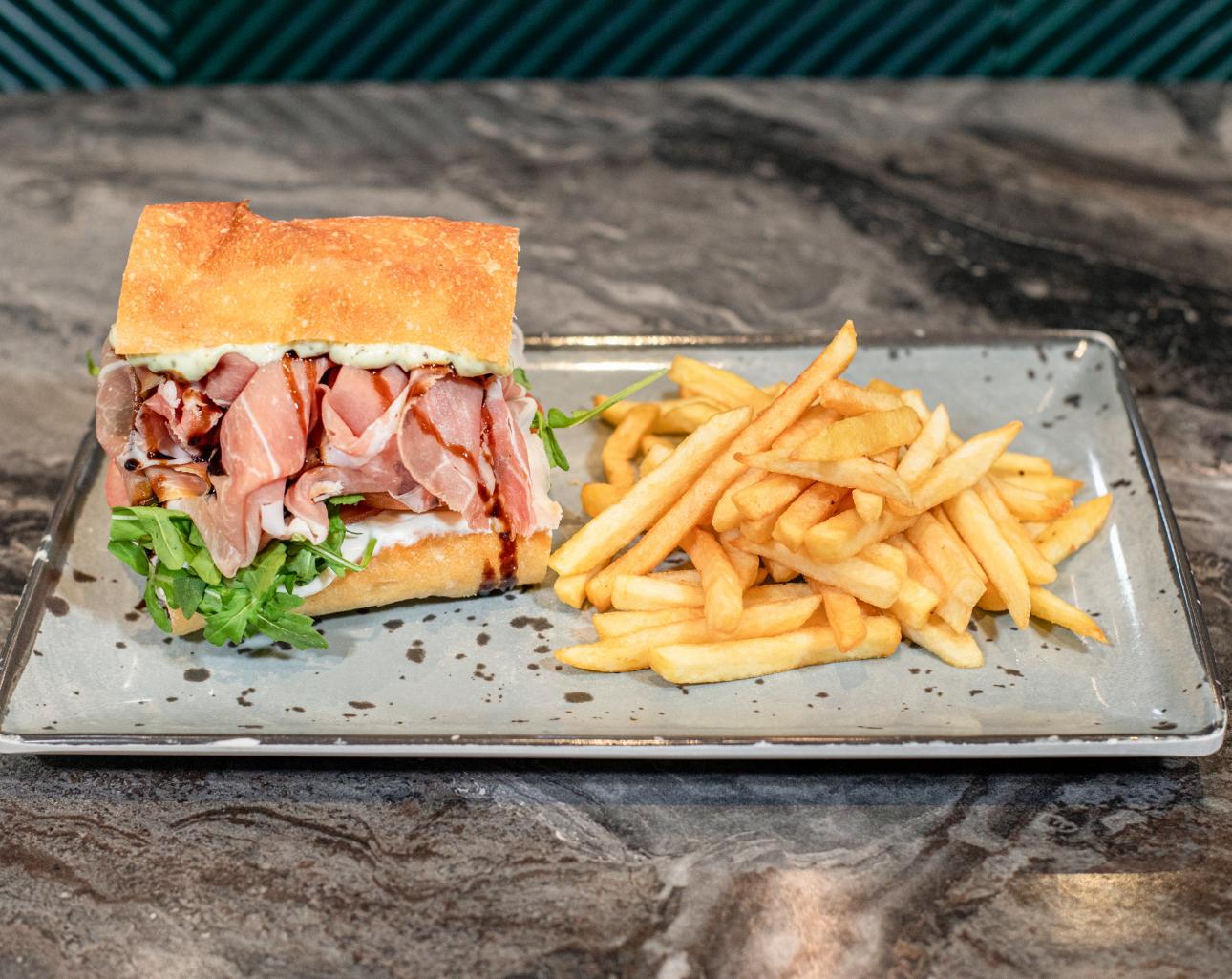 Prosciutto di Parma, whipped goat cheese, arugula, tomato, balsamic glaze and housemade pesto mayo on focaccia