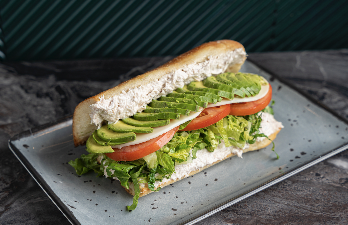 Tuna salad, provolone, avocado, lettuce, tomato on focaccia bread