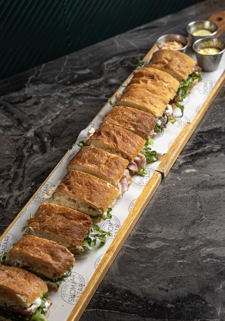 16 inches, choice of three sandwiches. Some sandwich choices have additional upcharges.