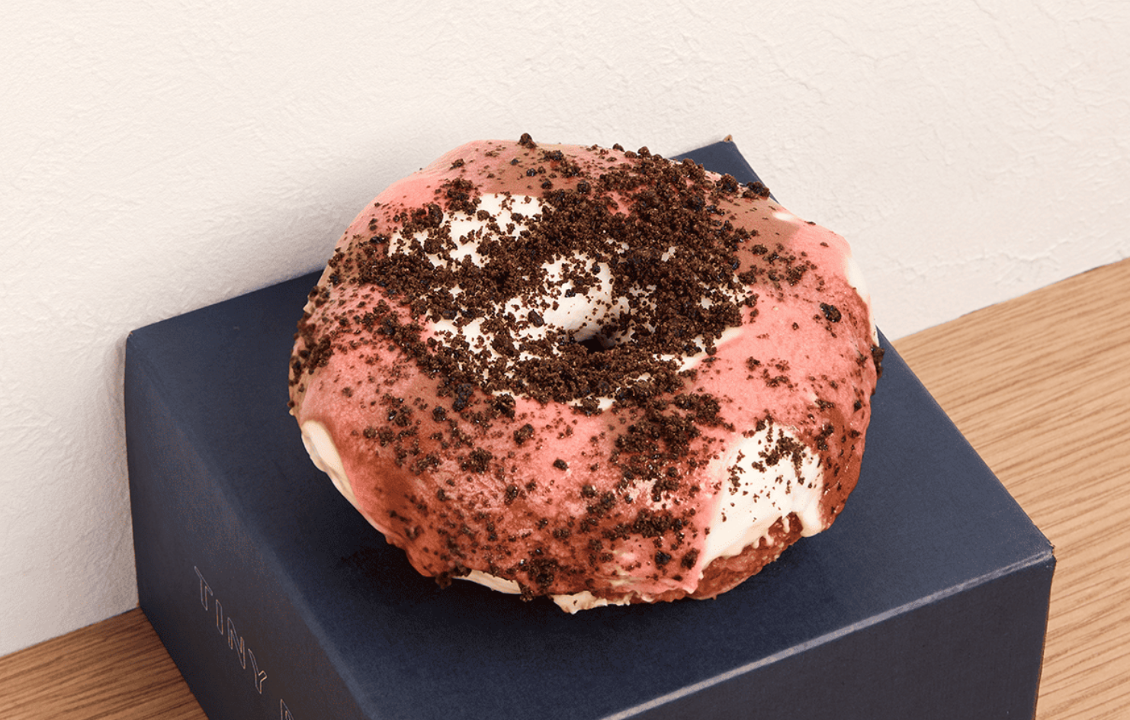 Vegan strawberry, chocolate, and vanilla dough layered like classic Neapolitan ice cream, dipped in a vegan vanilla-bean glaze & finished with crushed chocolate cookies.