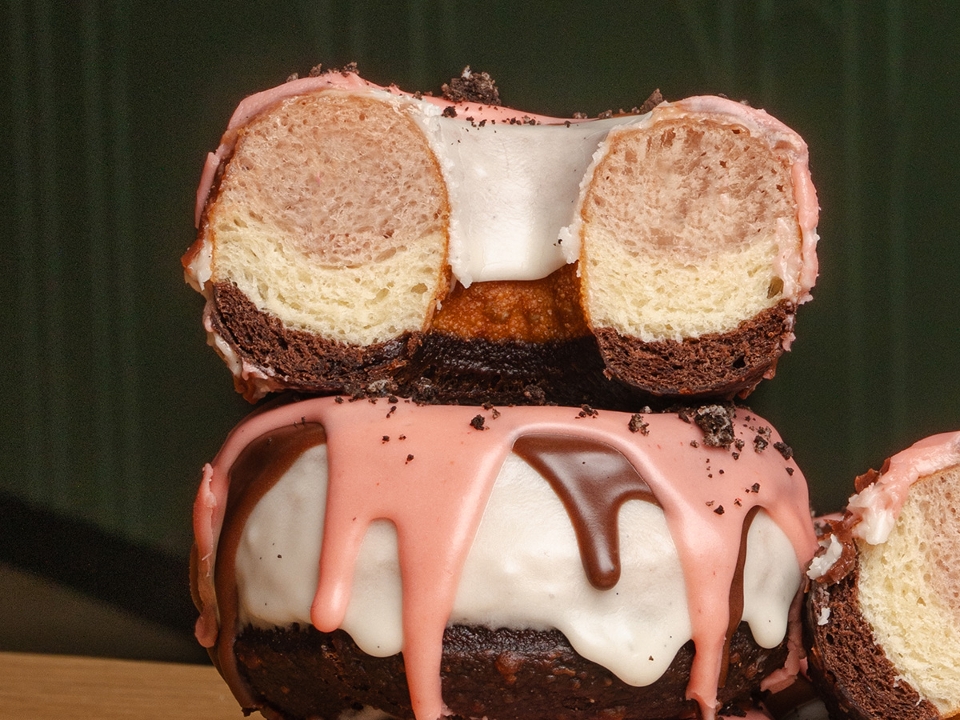 Vegan strawberry, chocolate, and vanilla dough layered like classic Neapolitan ice cream, dipped in a vegan vanilla-bean glaze & finished with crushed Oreos.
