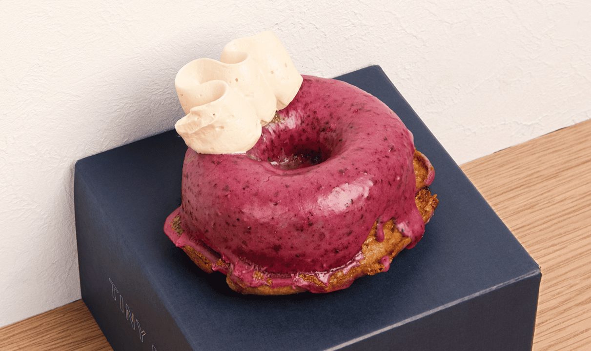 baked wild blueberry gf donut, maple & blueberry glaze, topped with a maple buttercream