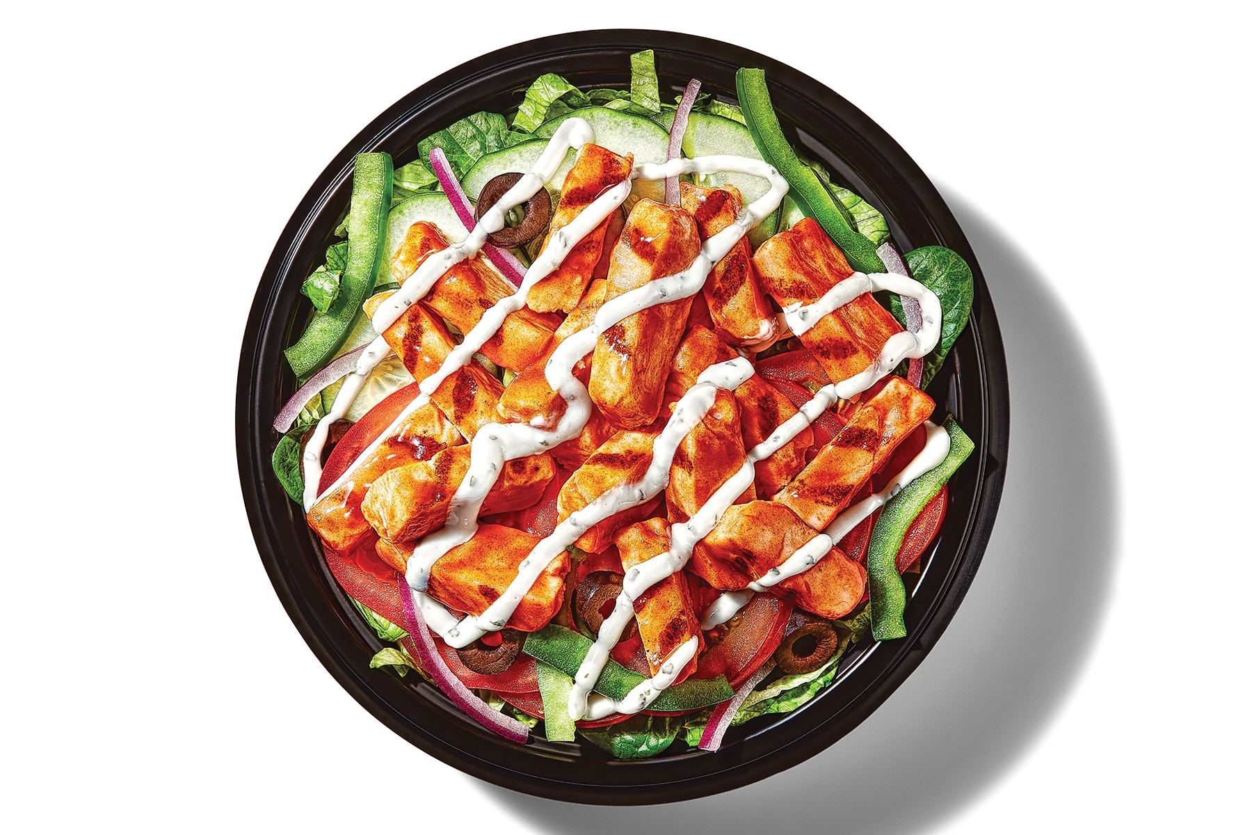 Tender Rotisserie-style chicken, Monterey cheddar cheese, bacon, Peppercorn Ranch, tomatoes, cucumbers, peppers, olives, & onions served on a bed lettuce & spinach.
