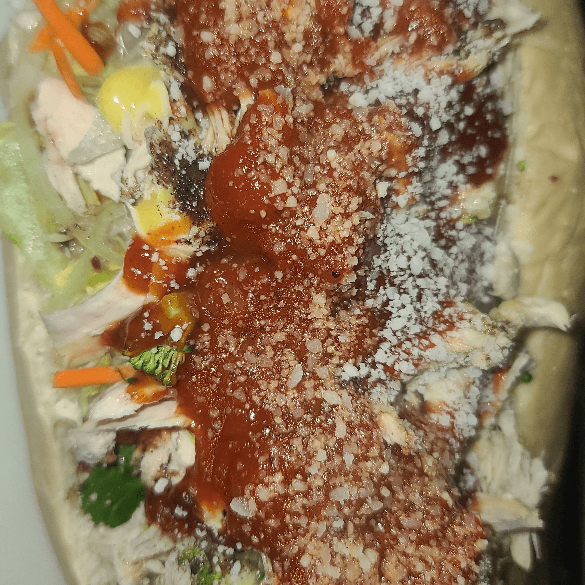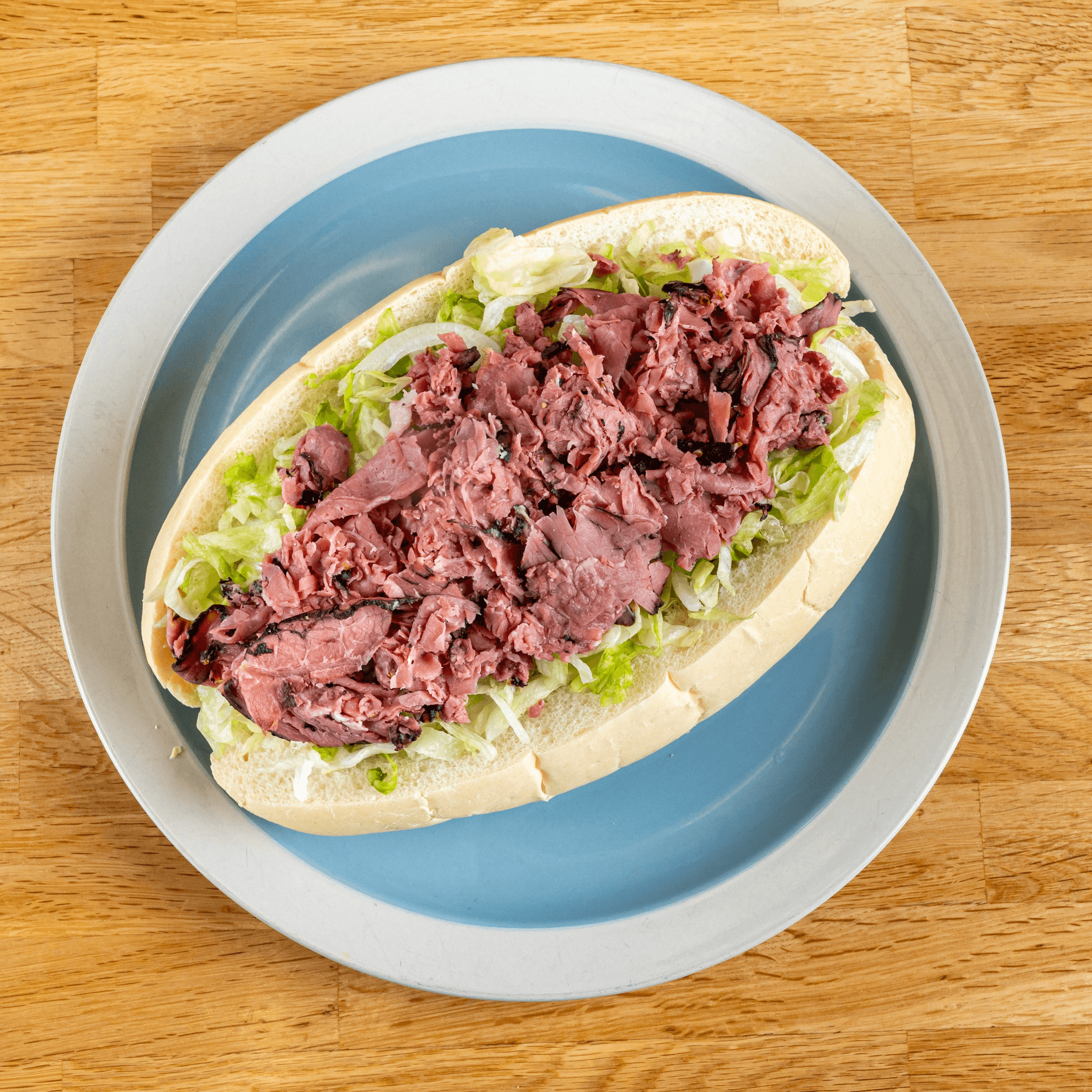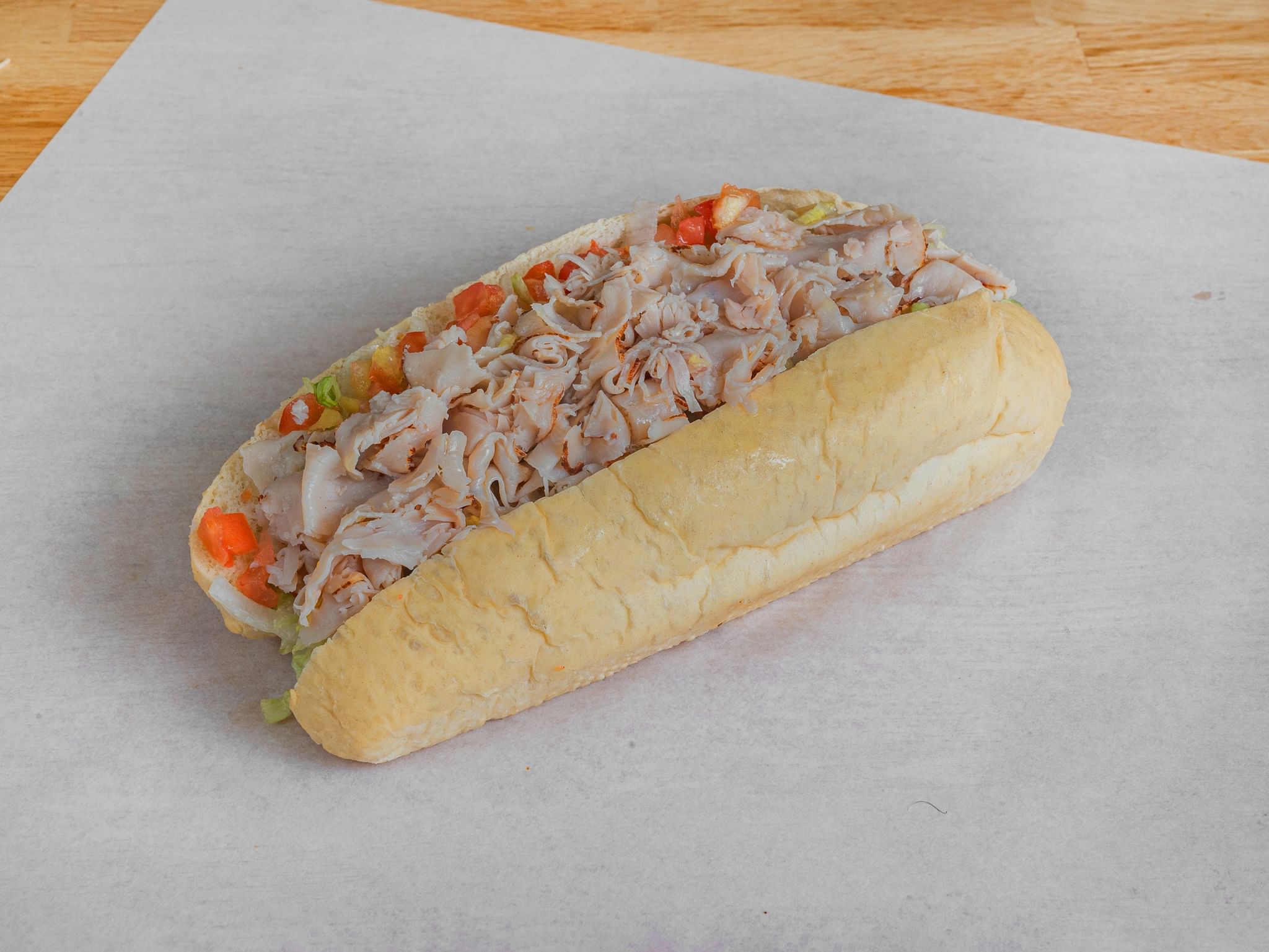 Large. With lettuce, tomato, onions, pickles, jalapenos, white or yellow shredded cheese