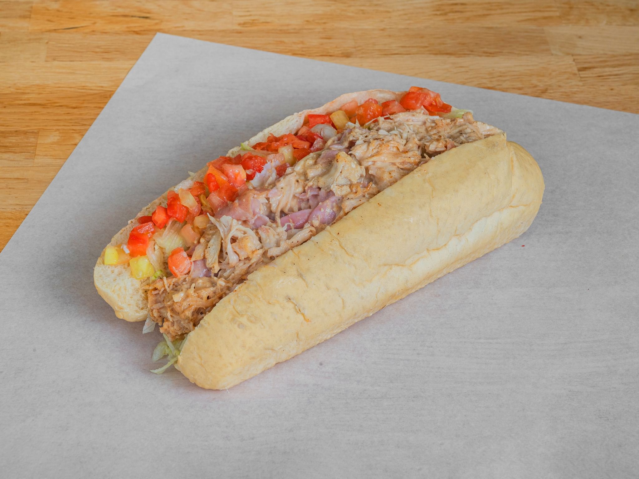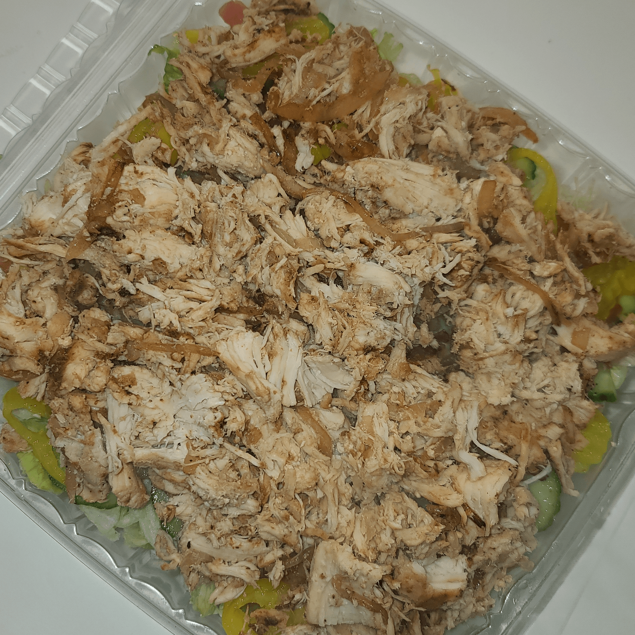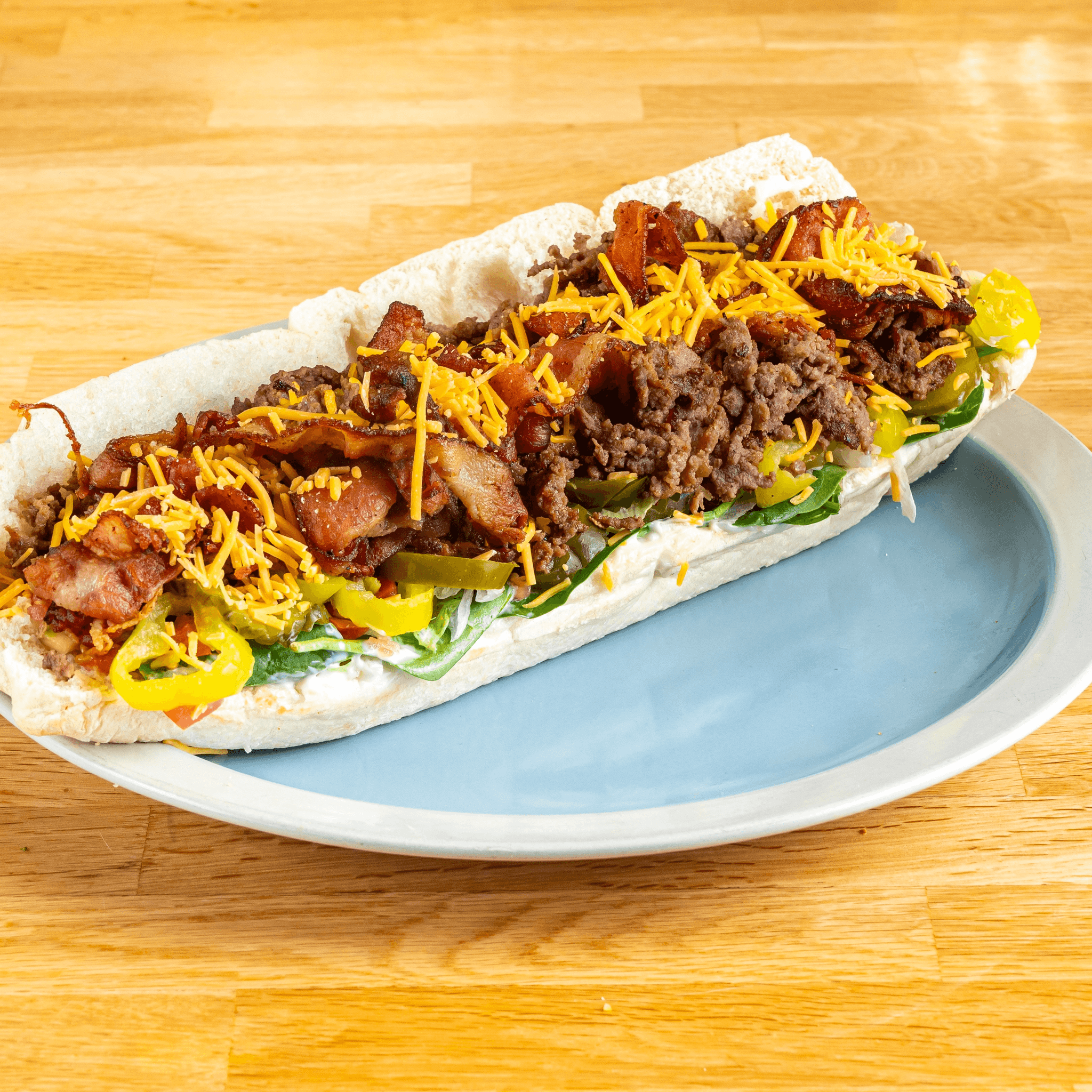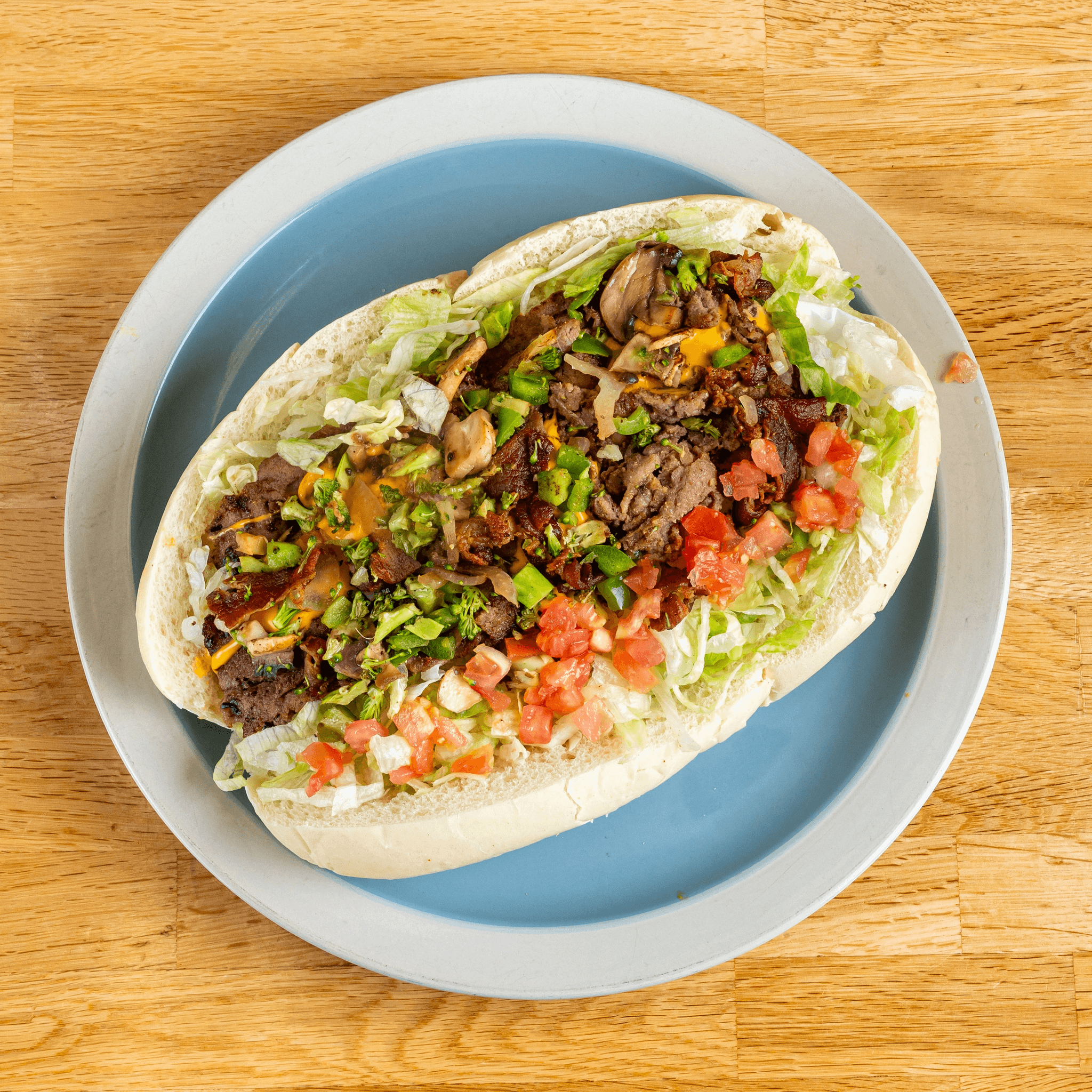 With lettuce, tomato, onions, pickles, jalapenos, white or yellow shredded cheese