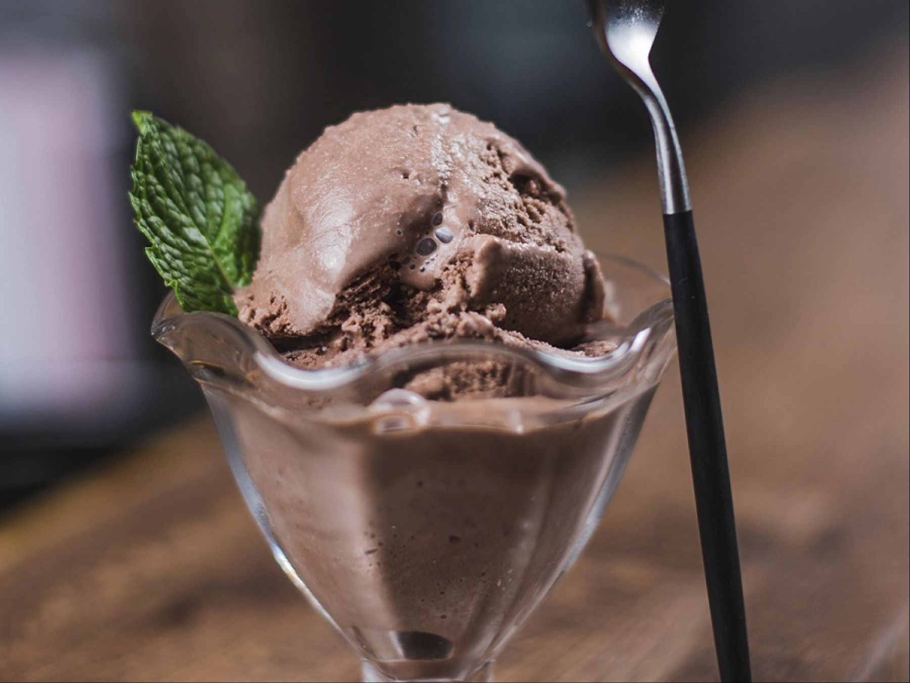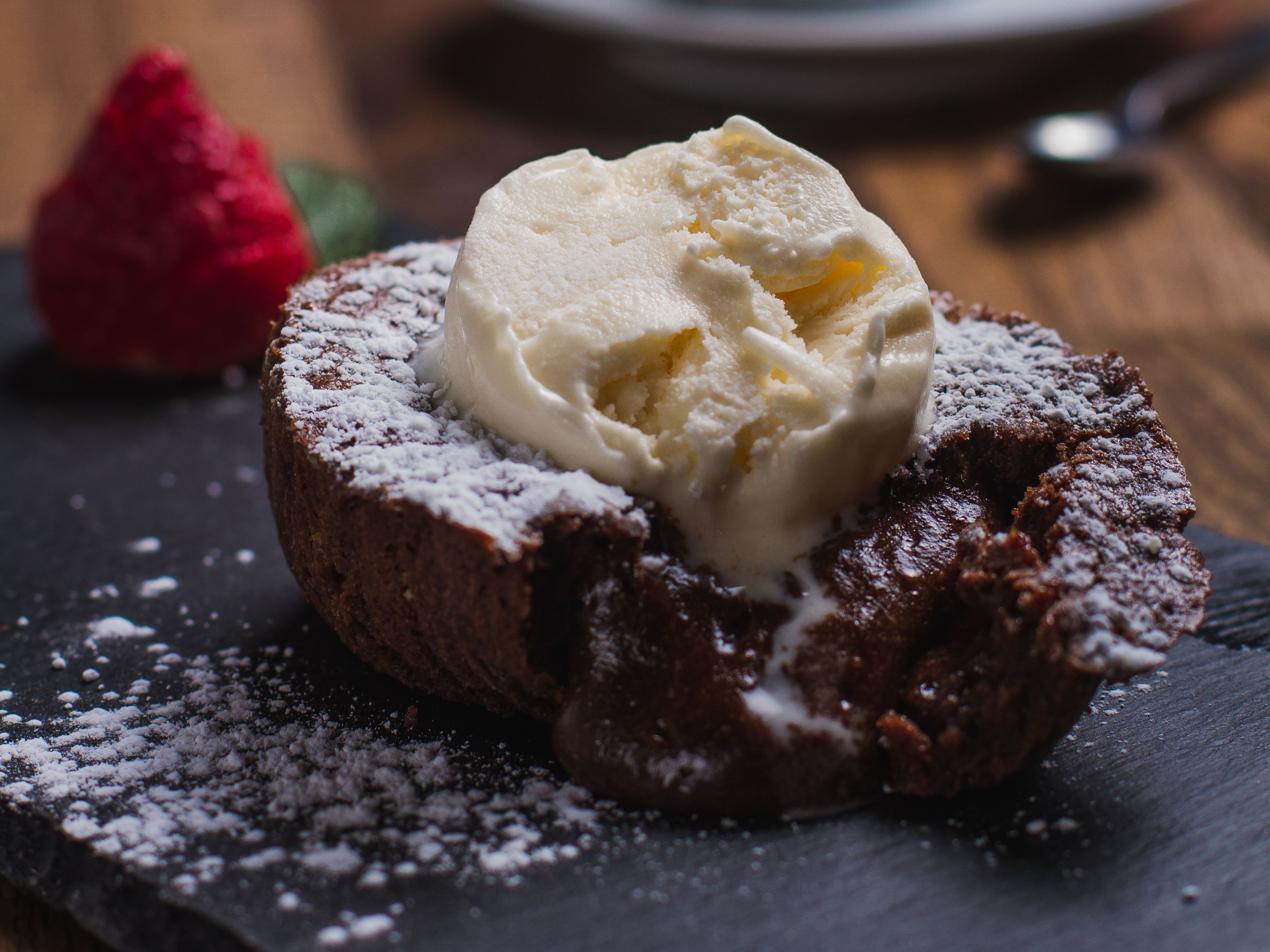 Warm flour cake with molten chocolate center served with one scoop of vanilla ice cream