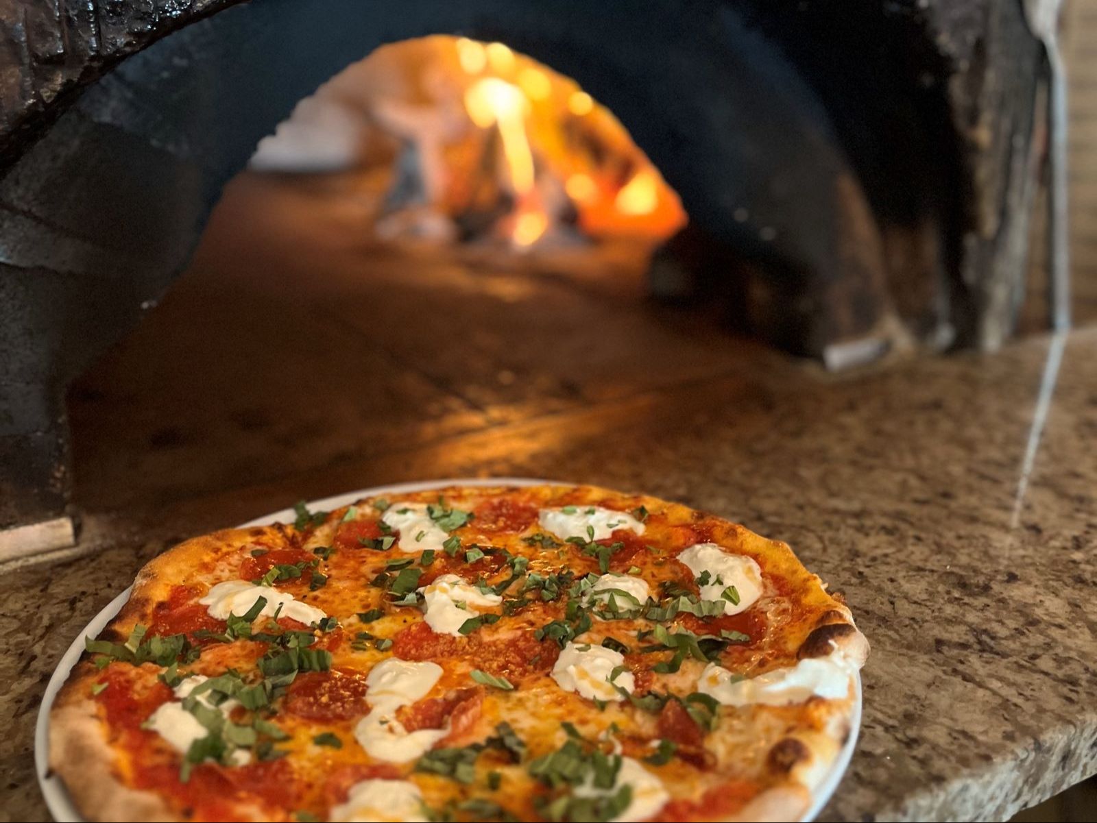 Homemade pizza dough, tomato sauce, pepperoni, burrata, mozzarella, spicy honey drizzle and fresh basil