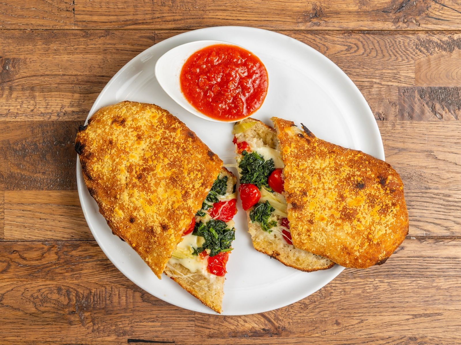 Homemade panini bread, tomato sauce, mozzarella, mushrooms, asparagus and spinach