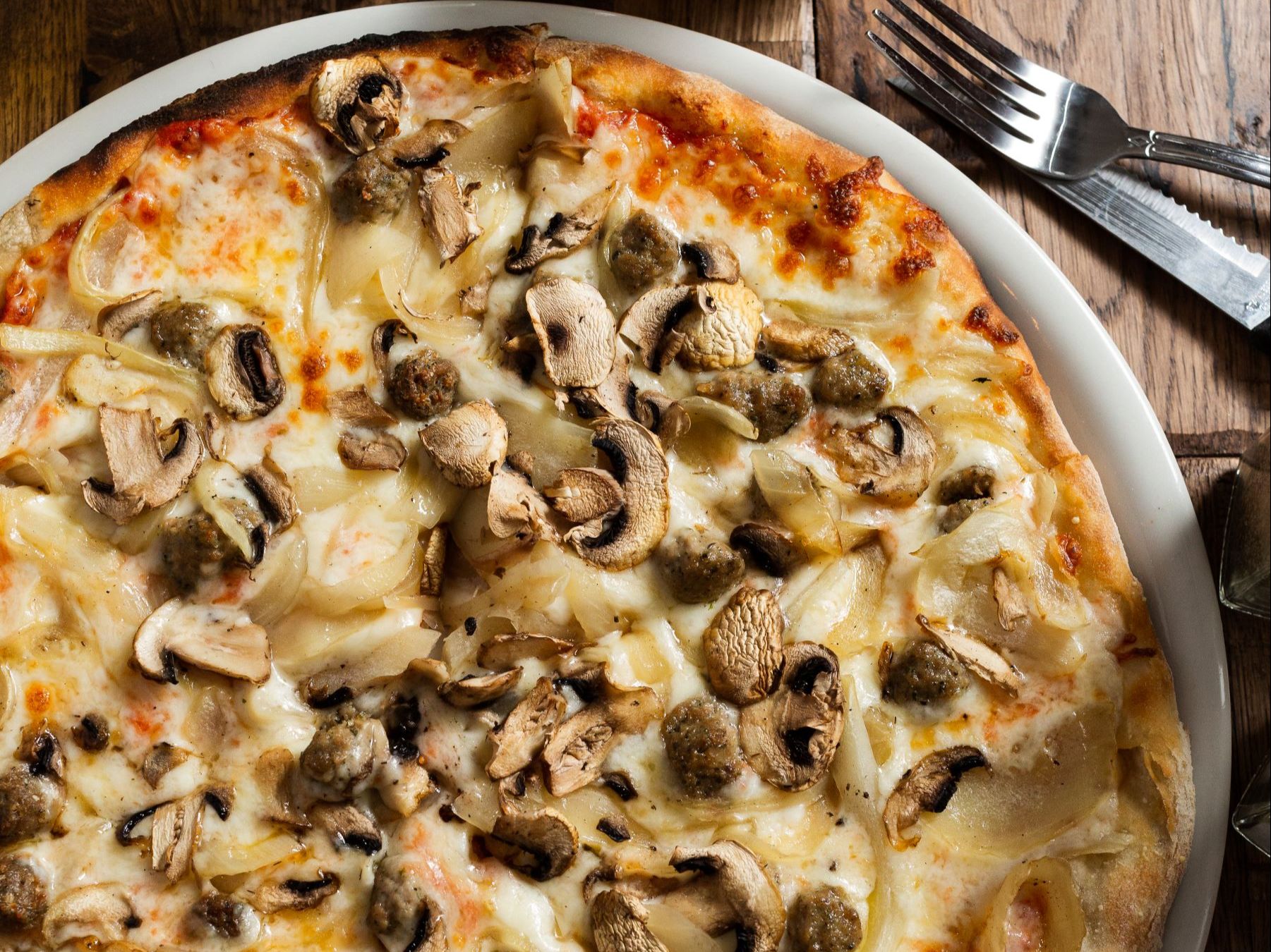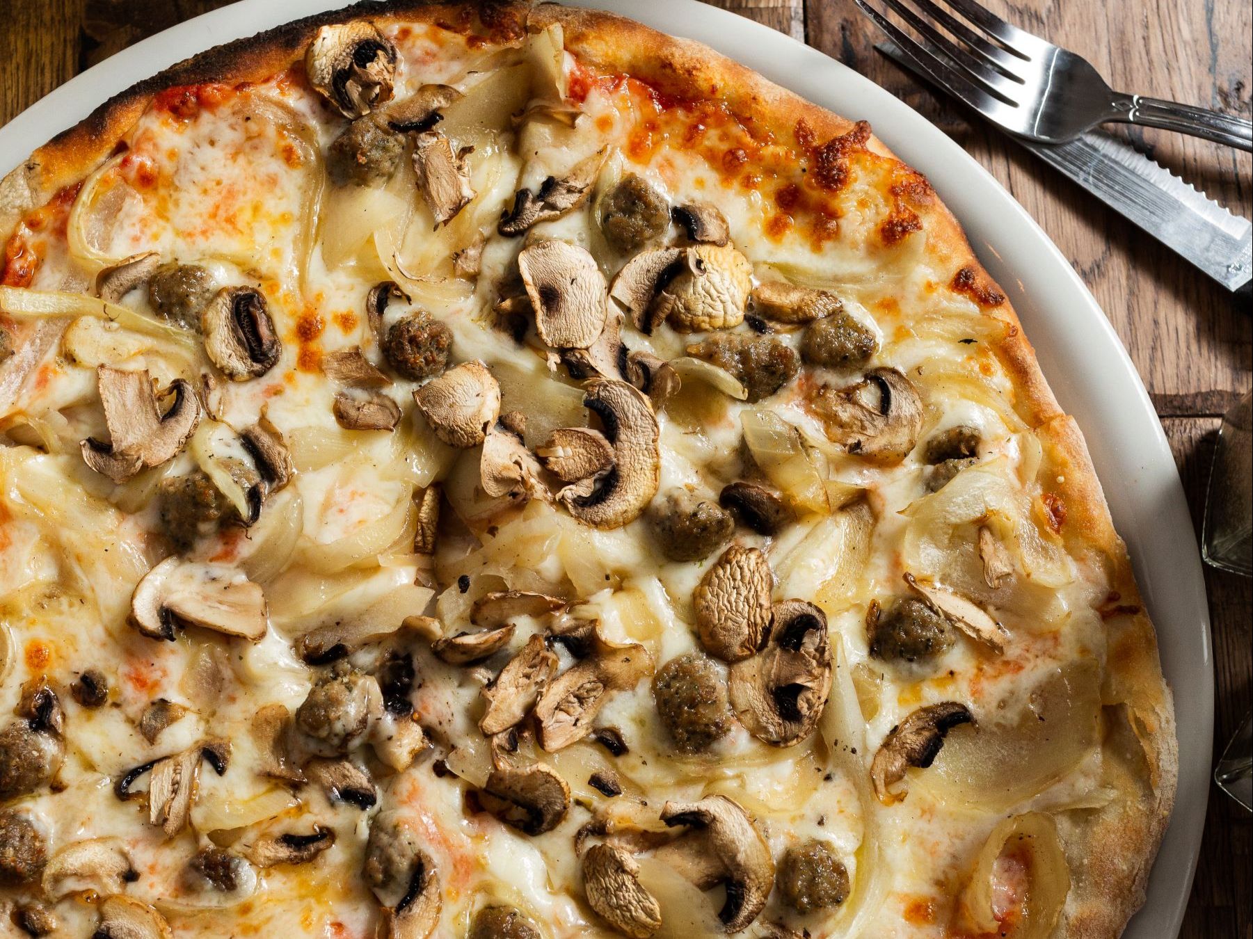 Homemade pizza dough, tomato sauce, mozzarella, meatballs, mushrooms and caramelized onions