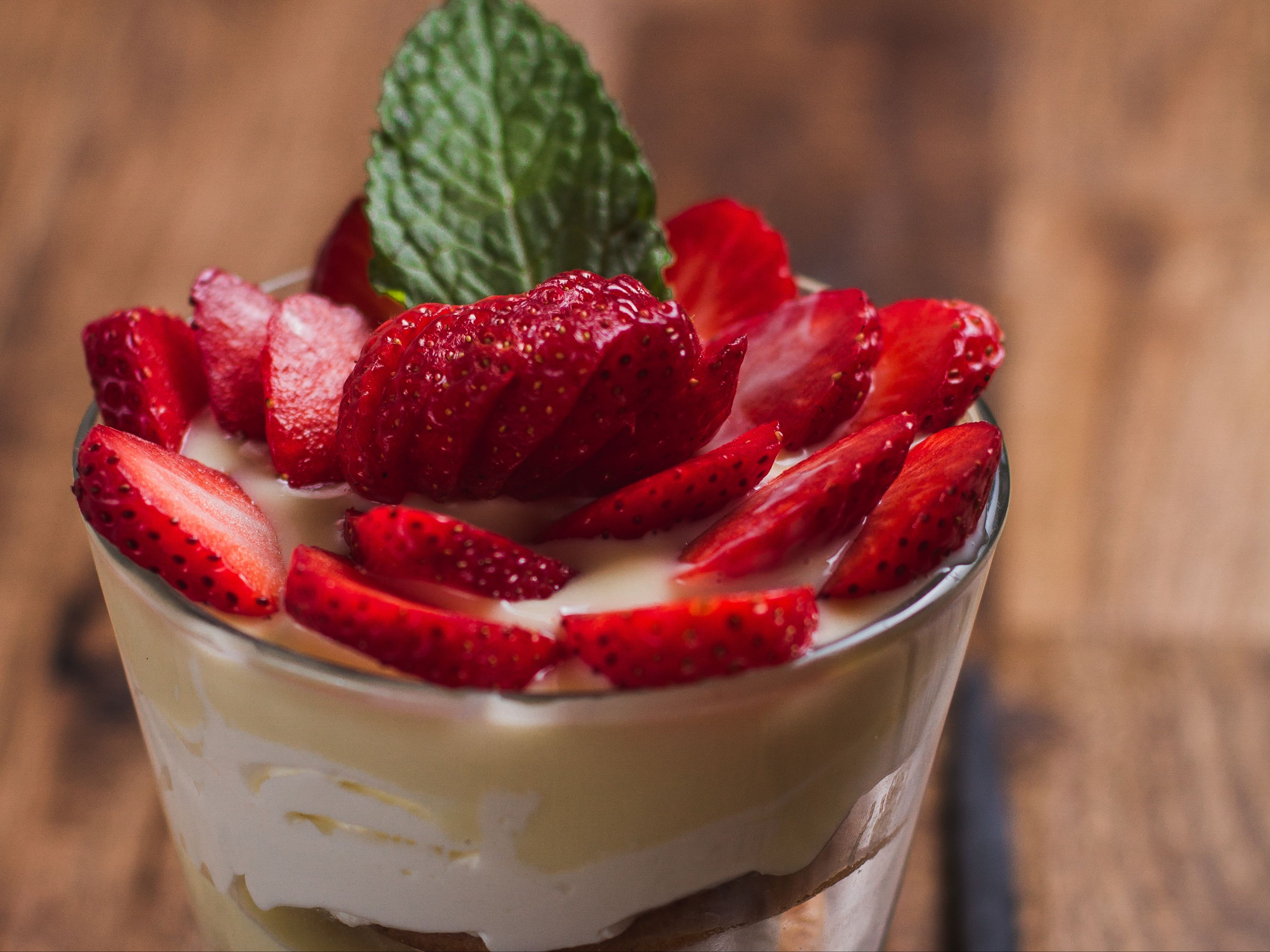 Layers of strawberries, whipped cream, and condensed milk with vanilla cookies dipped in chocolate