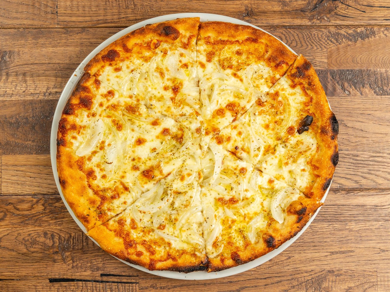 Homemade pizza dough, mozzarella, gorgonzola, goat cheese and Parmesan cheese.