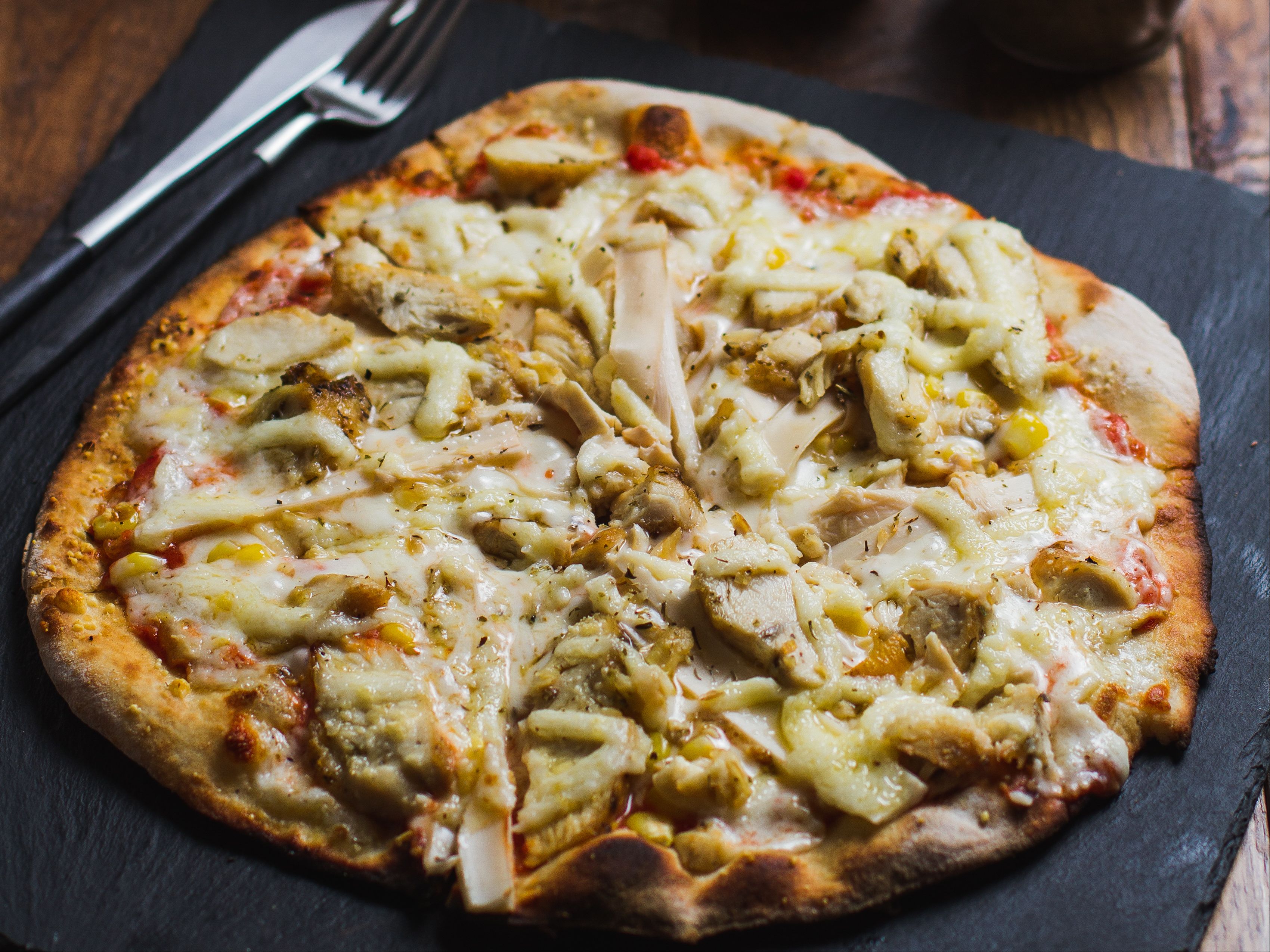 Homemade pizza dough, tomato sauce, catupiry cheese, corn, heart of palm, grilled chicken and mozzarella