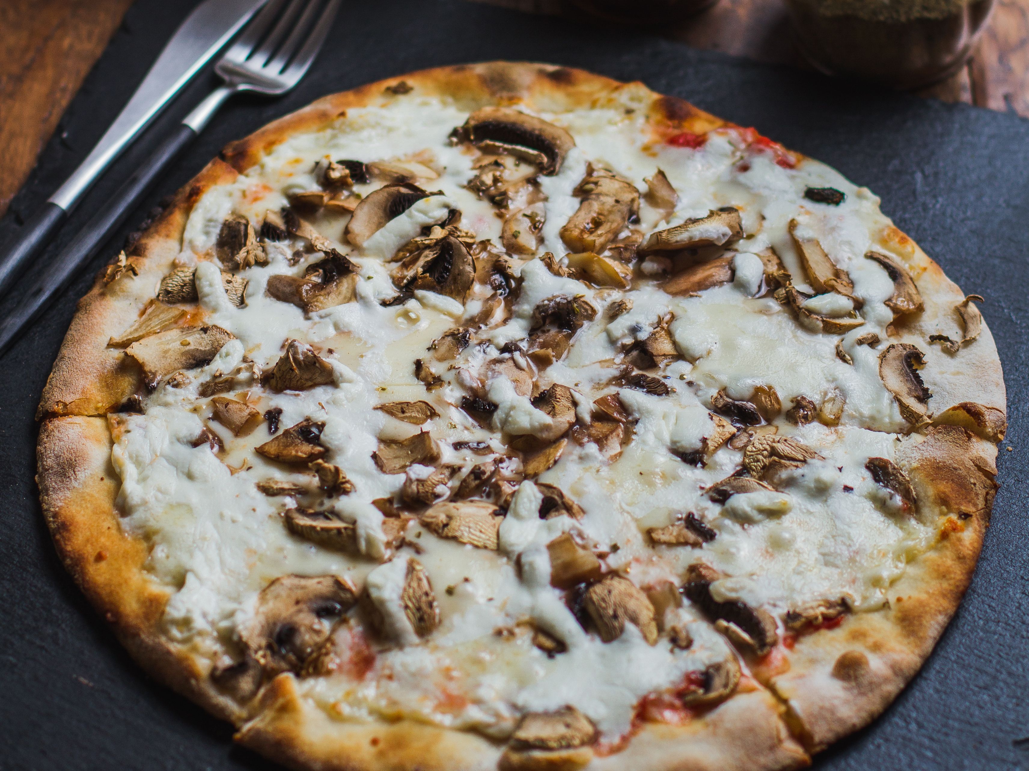 Homemade pizza dough, tomato sauce, ricotta, mozzarella, parmesan cheese, mushrooms and fresh basil.