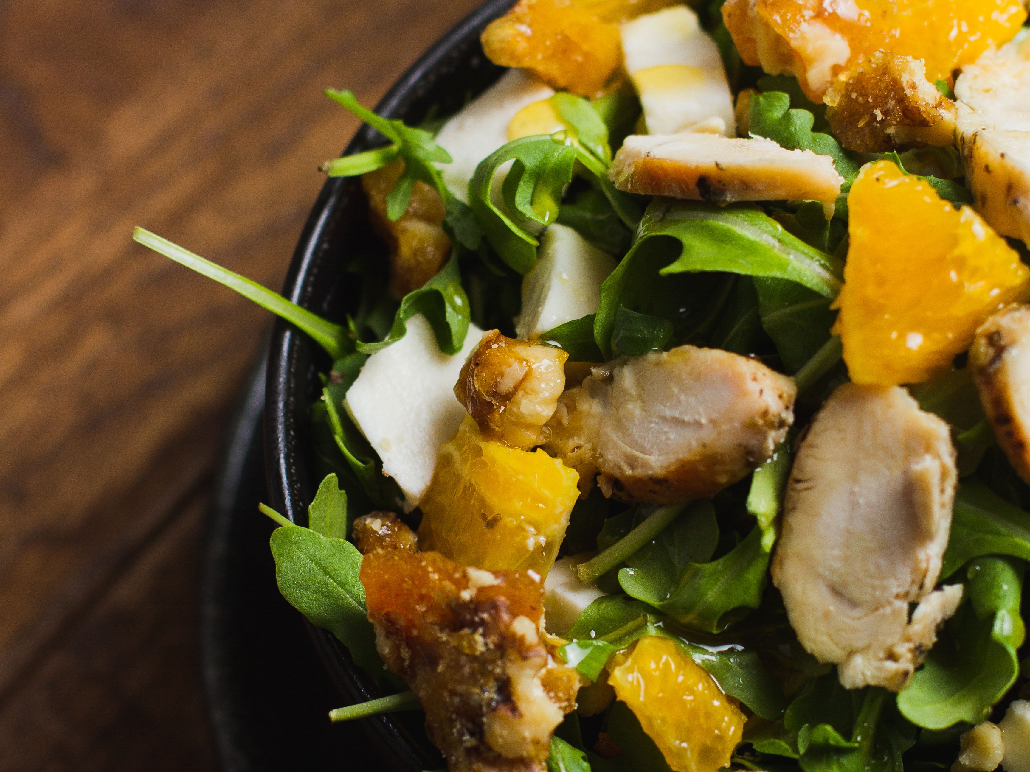 Organic arugula, cherry tomatoes, fresh buffalo mozzarella, orange wedges, walnuts, and diced chicken with a honey-lemon dressing