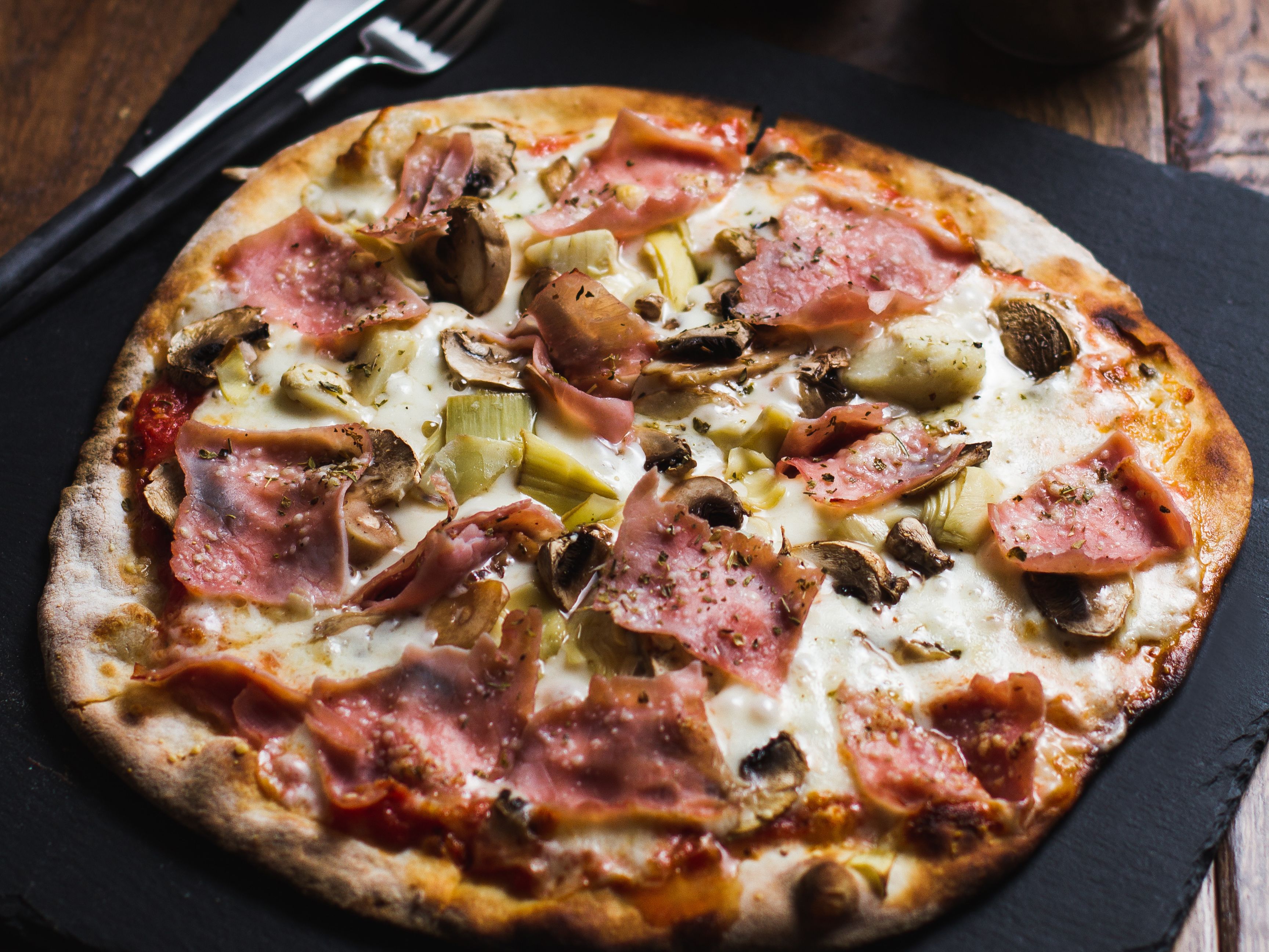 Homemade pizza dough, tomato sauce, mozzarella, ham, mushrooms and artichokes.