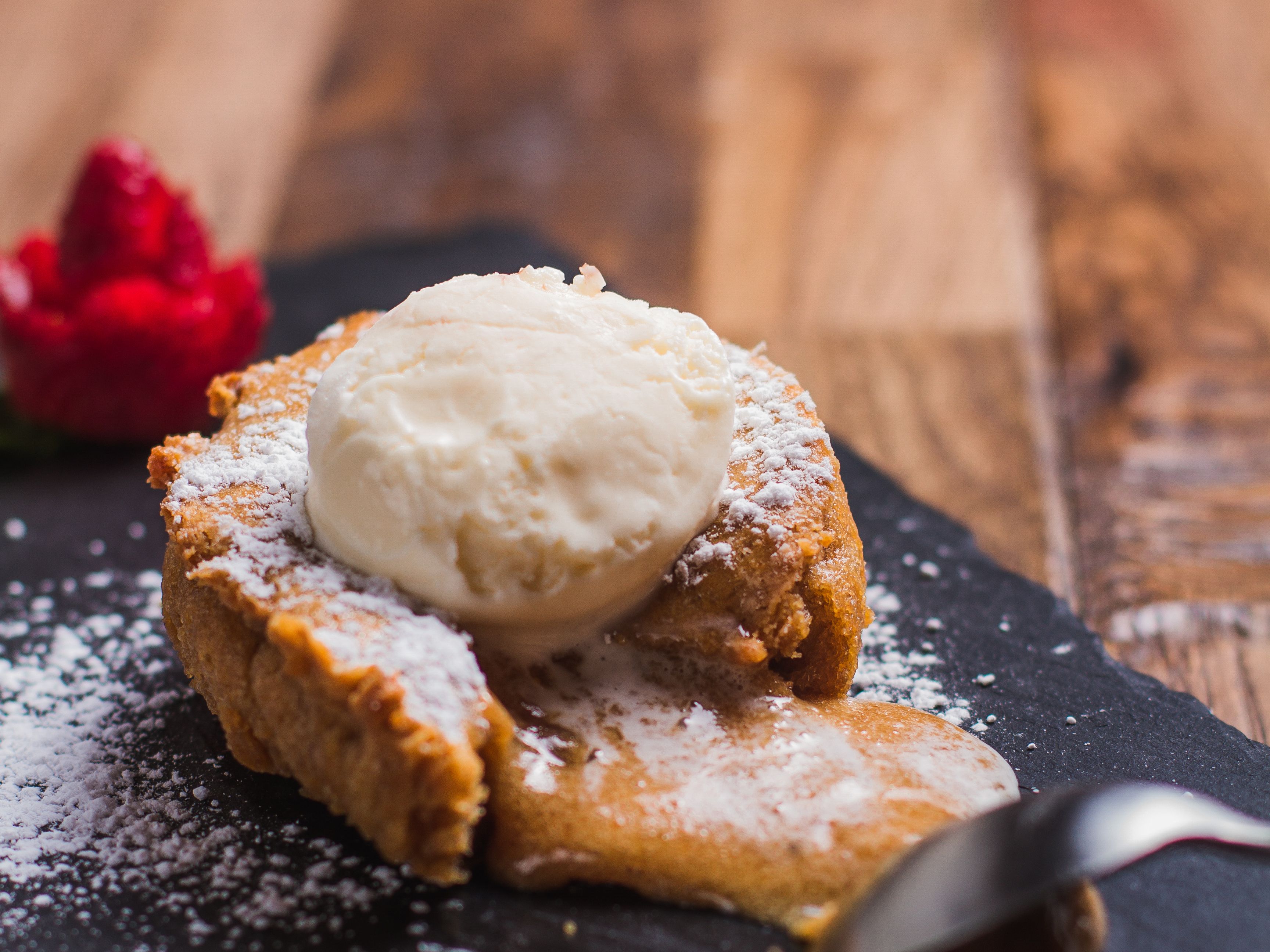 Warm flour cake with molten guava center served with guava-mascarpone-and-cream cheese ice cream