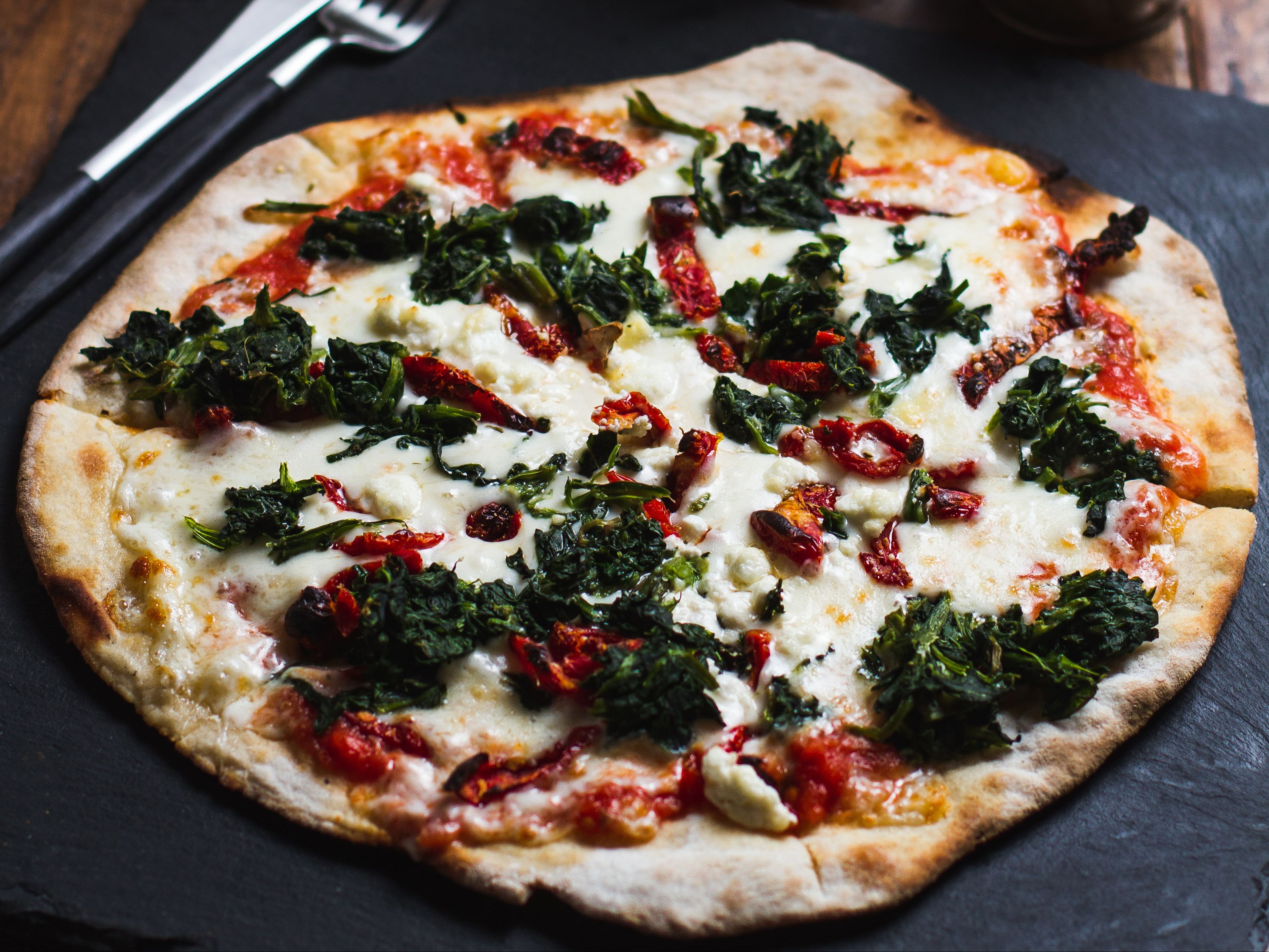 Homemade pizza dough, tomato sauce, mozzarella, spinach, goat cheese and sun-dried tomatoes.