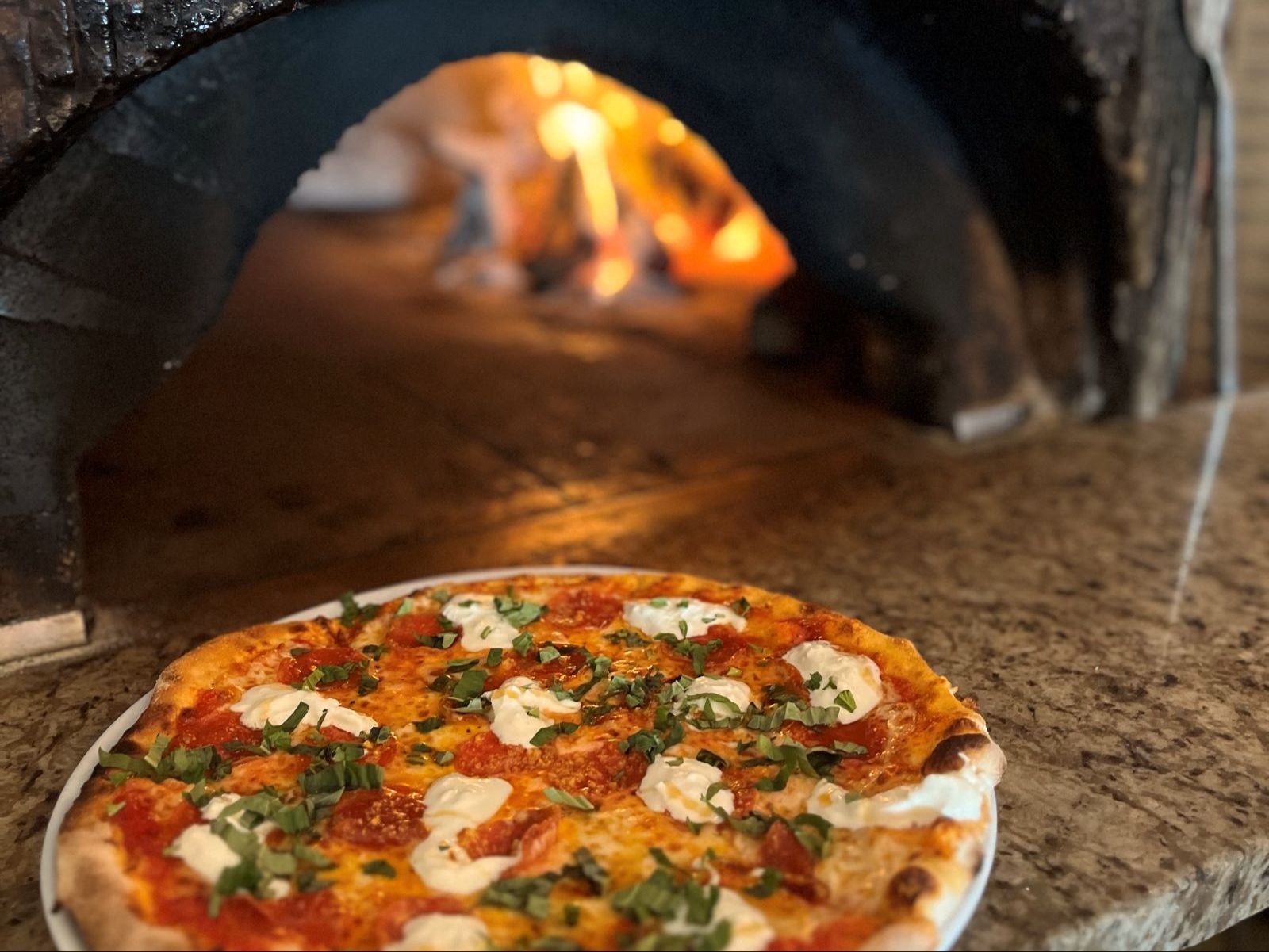 Homemade pizza dough, tomato sauce, mozzarella, creamy burrata cheese and fresh basil
