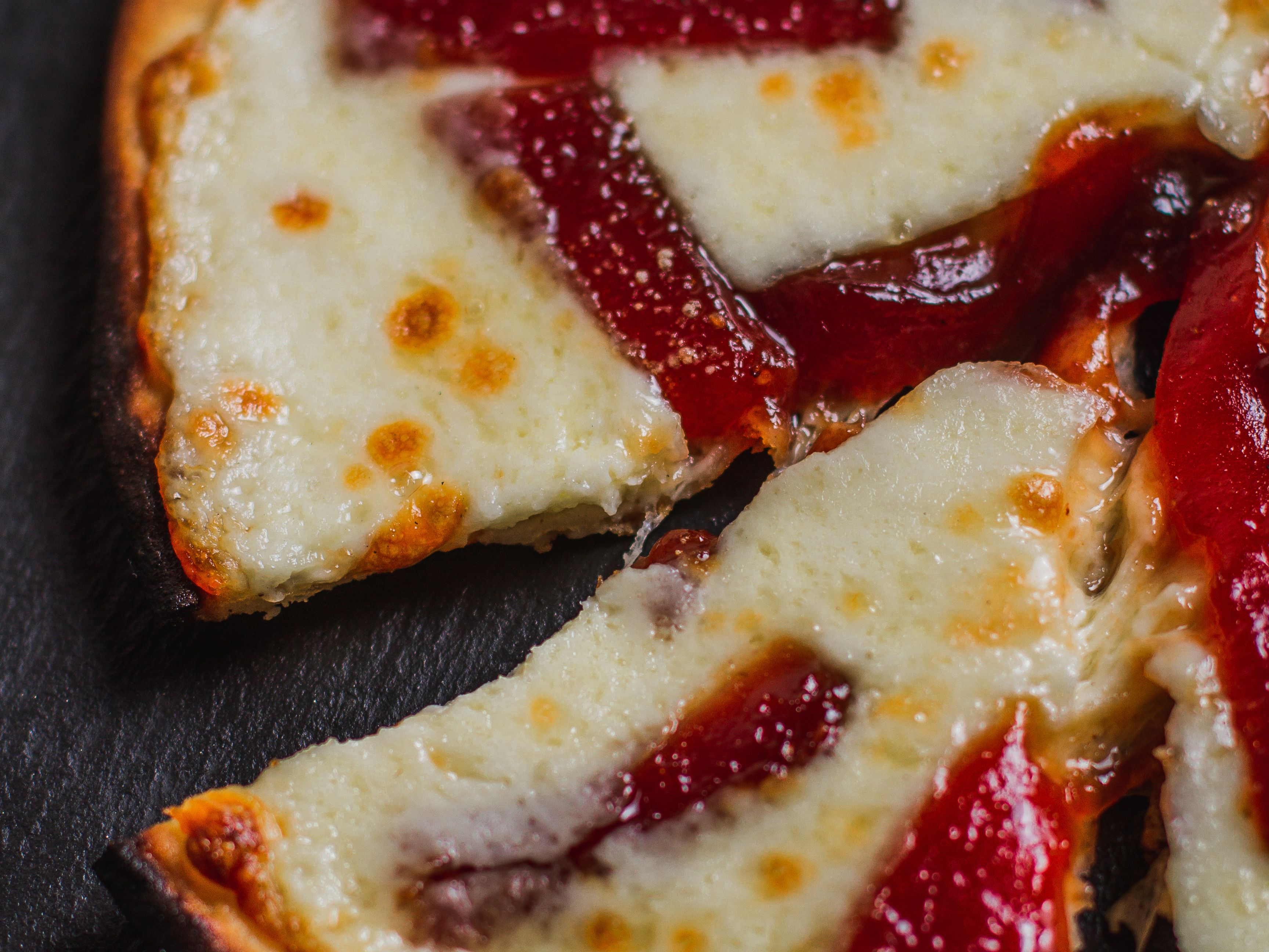 Homemade pizza dough topped with guava marmalade and mozzarella cheese