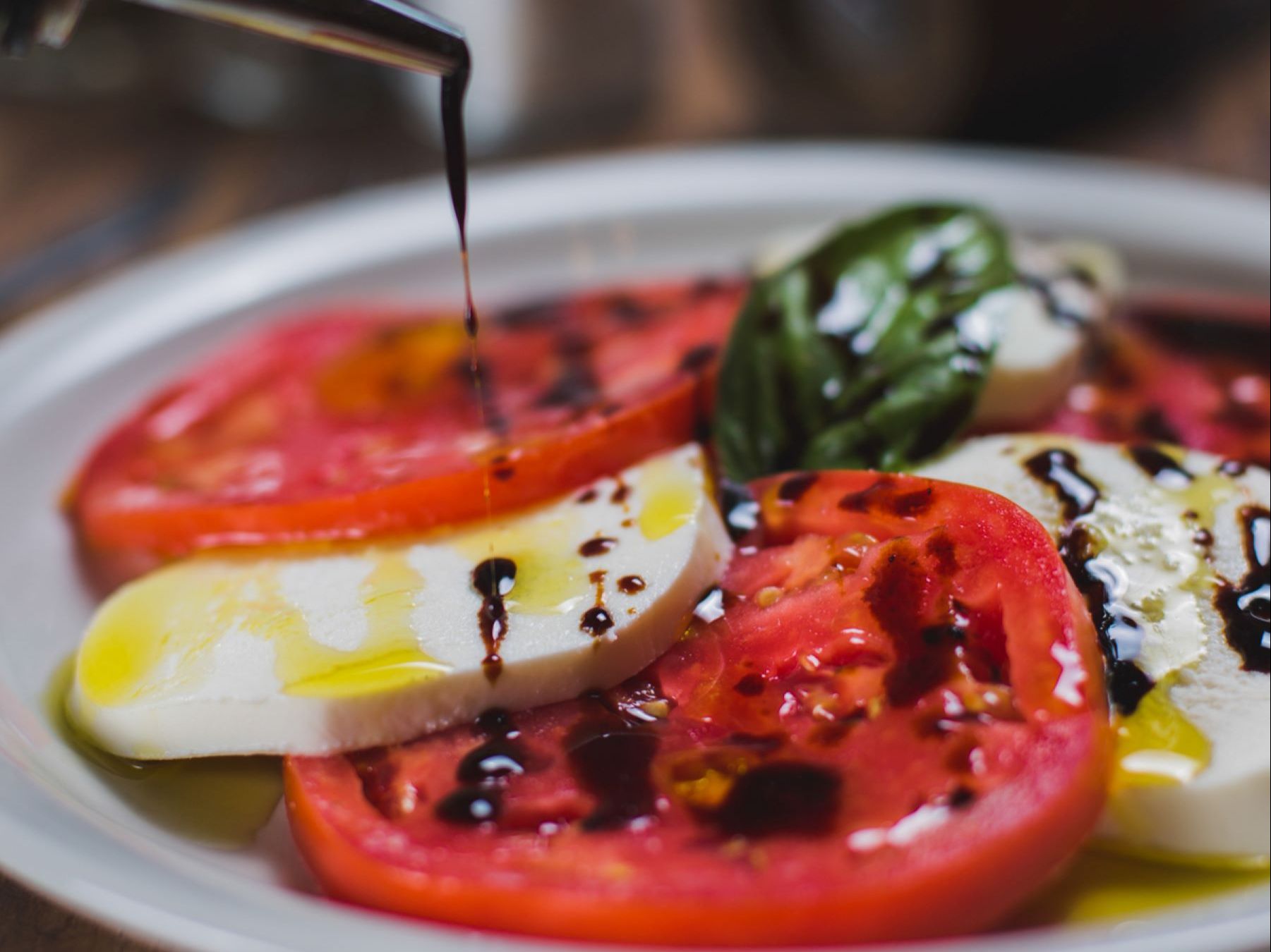 Creamy mozzarella, sliced tomatoes, olives, organic arugula and fresh basil