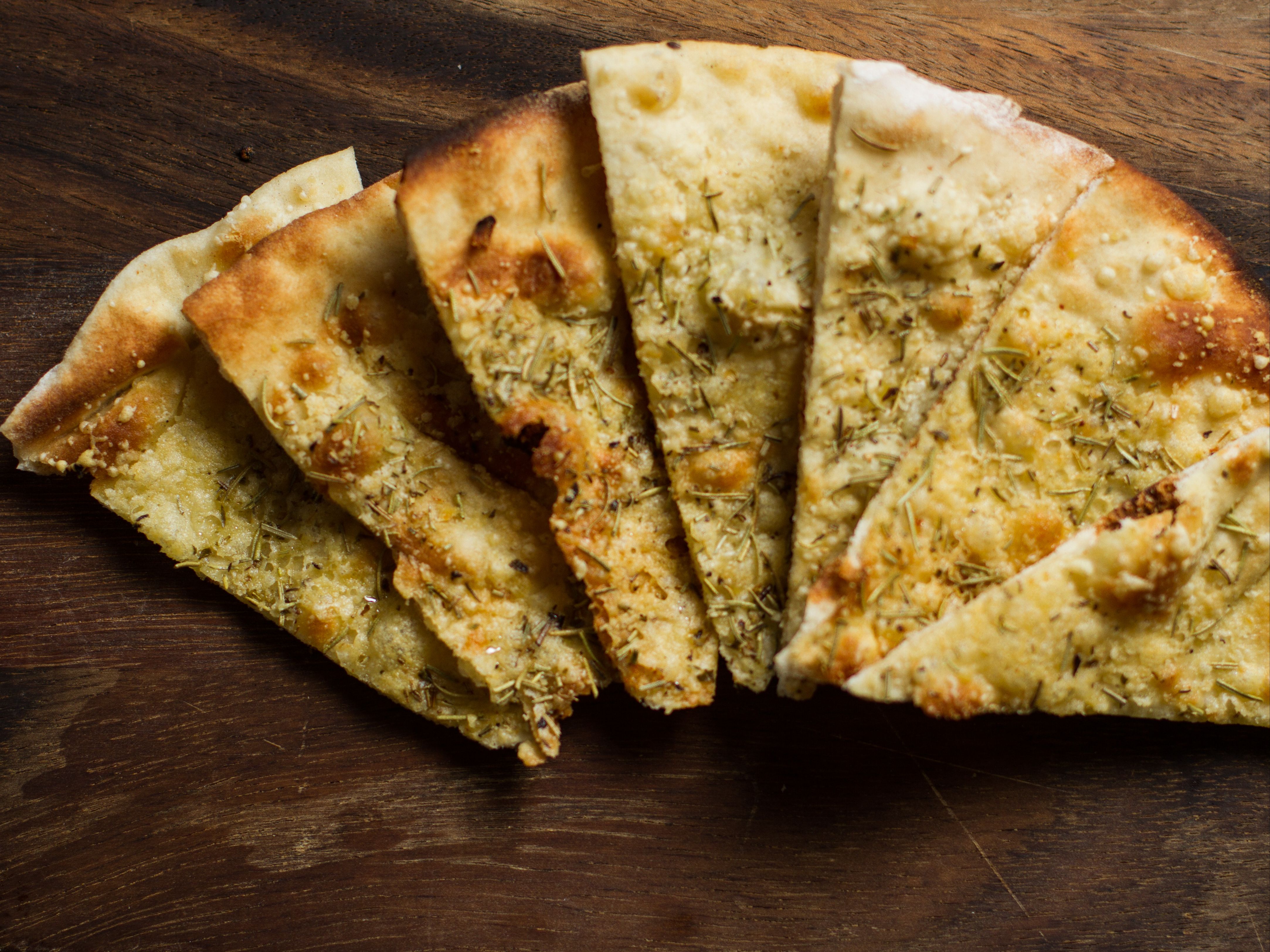 Focaccia topped with rosemary, olive oil and Parmesan cheese