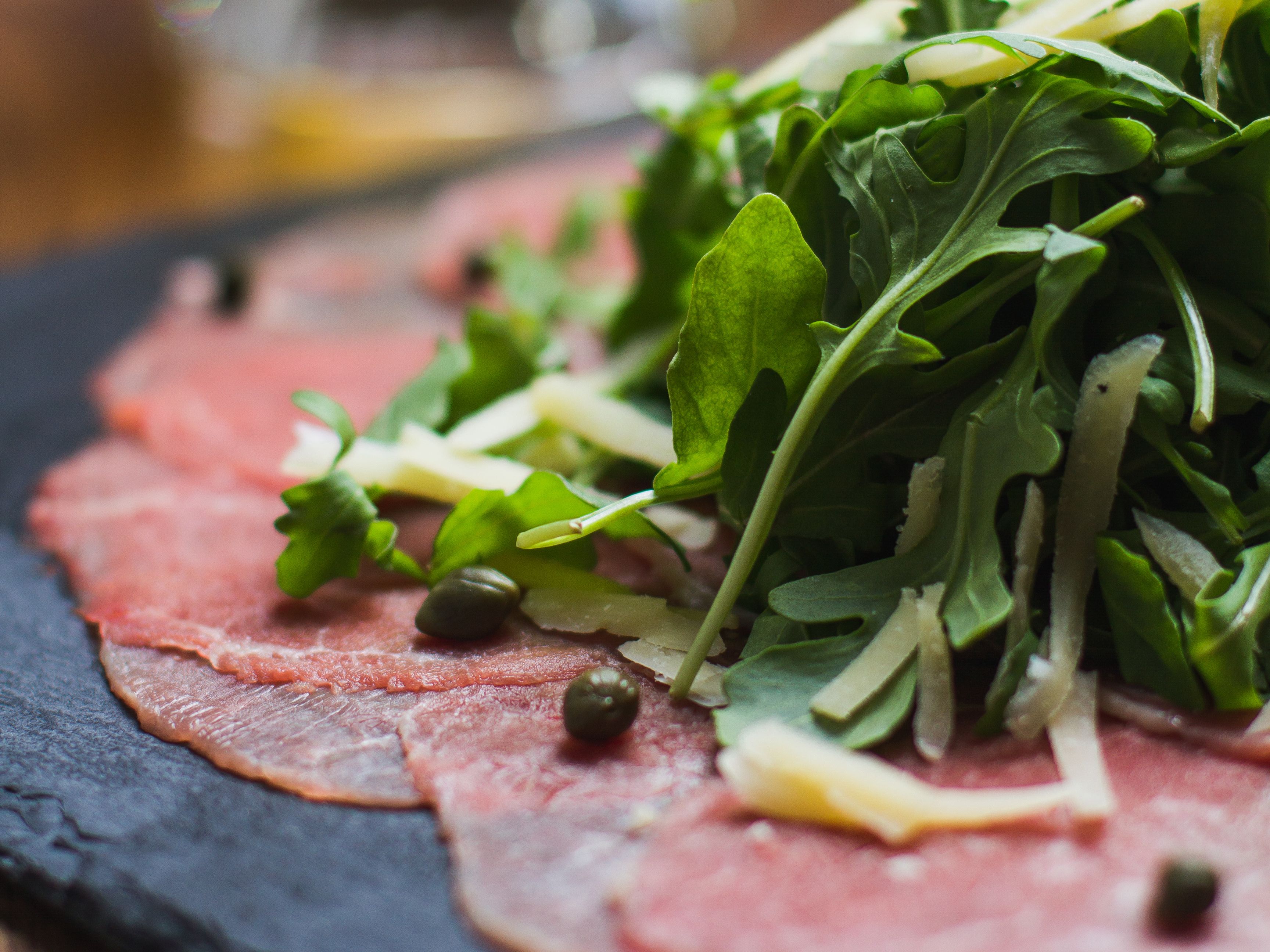 Thinly-sliced beef tenderloin, mustard dressing, capers, arugula, artichokes and parmesan shaves