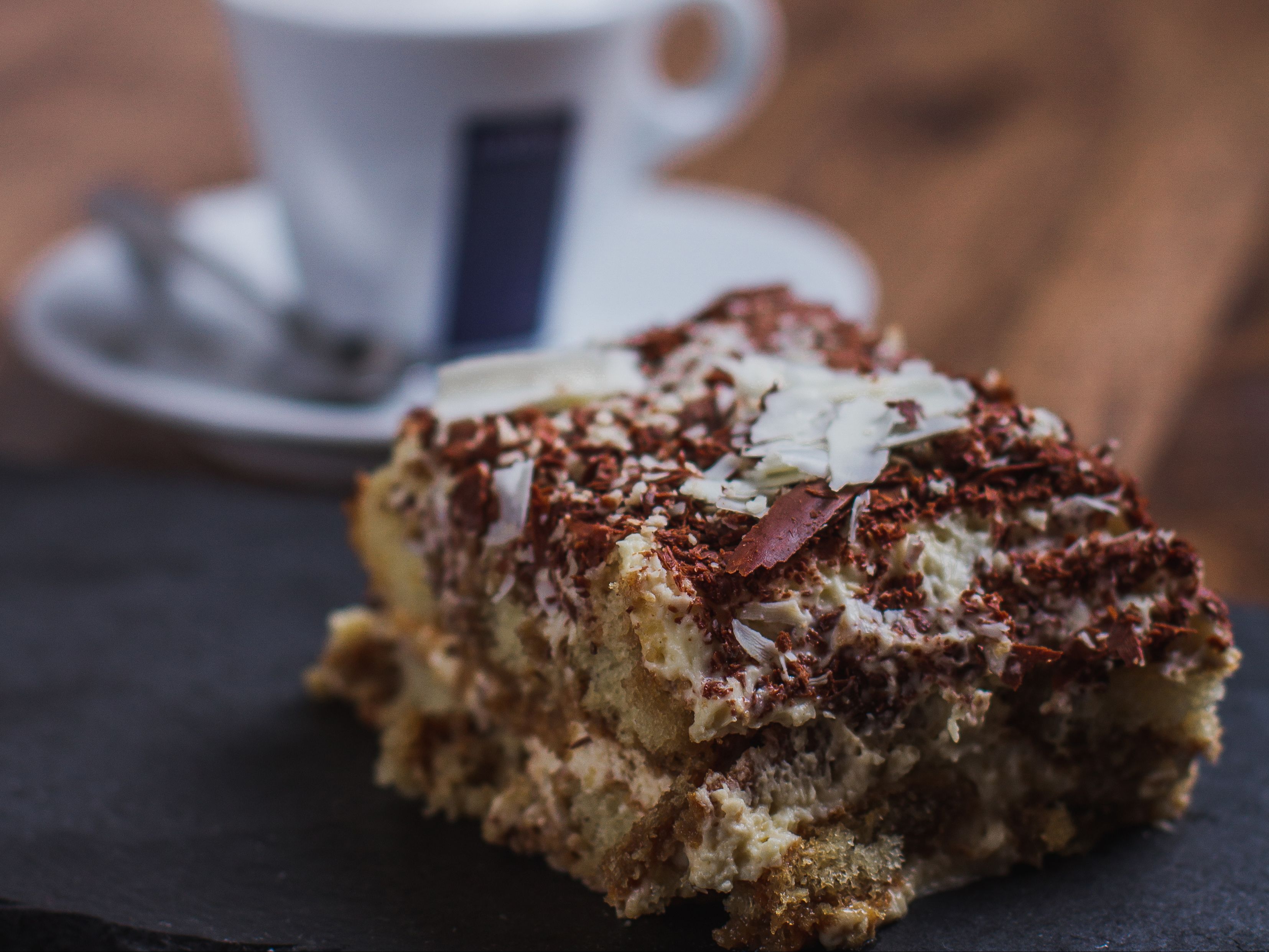 Spongy cake made of ladyfingers dipped in coffee, layered with a whipped mixture of eggs, sugar, and mascarpone cheese, topped with shaved chocolate flakes.