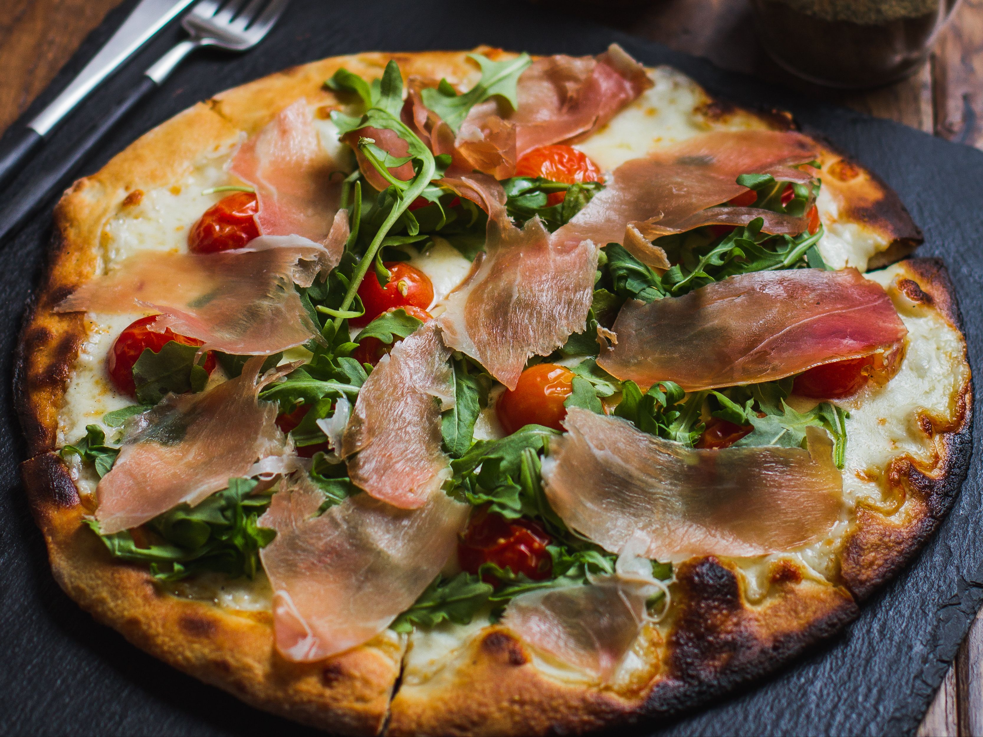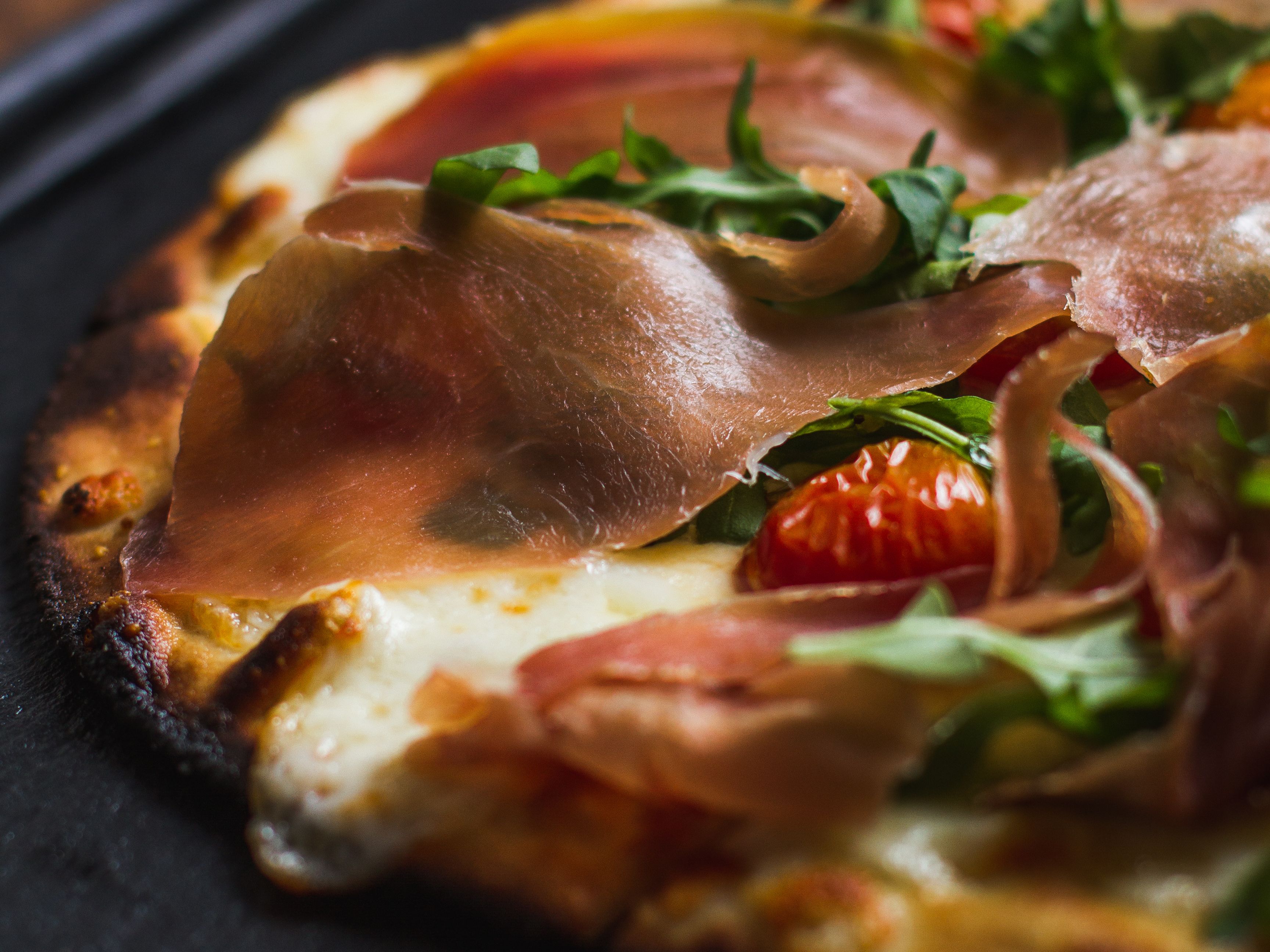 Homemade pizza dough, cherry tomatoes, mozzarella, organic arugula, Parmesan cheese and prosciutto.