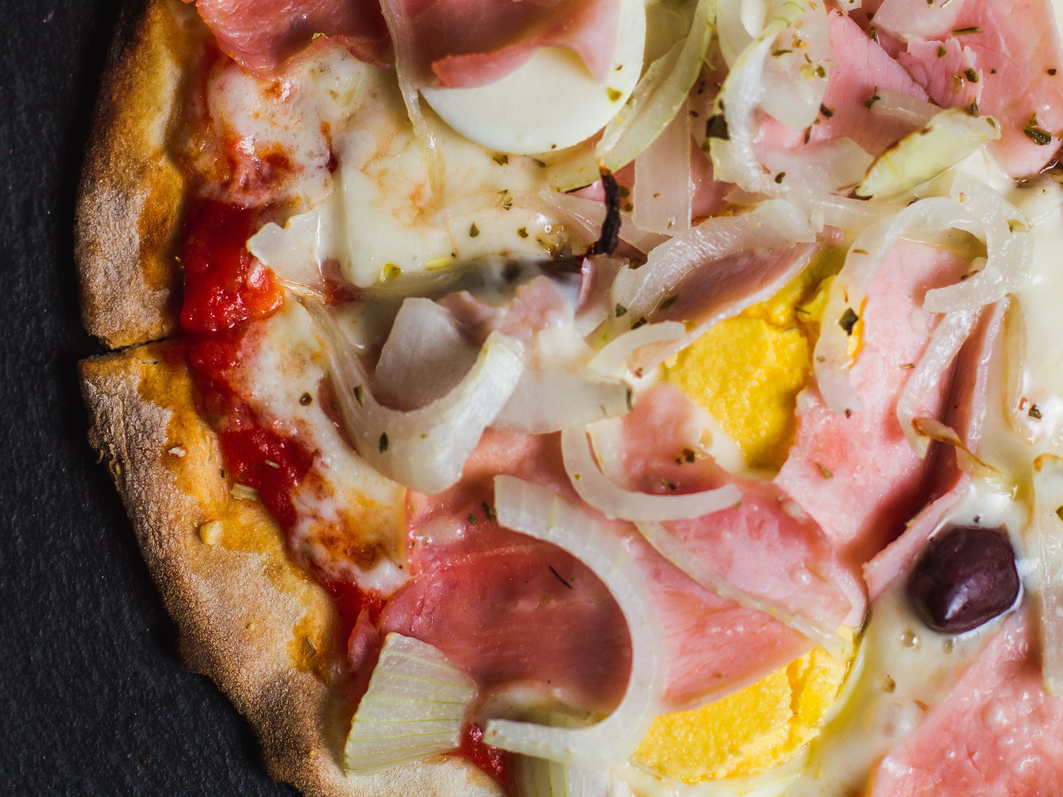 Homemade pizza dough, tomato sauce, ham, mozzarella, black olives, egg and onions.